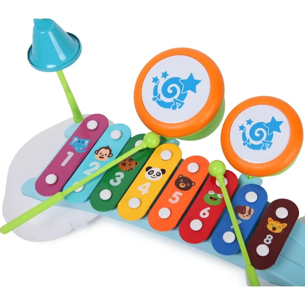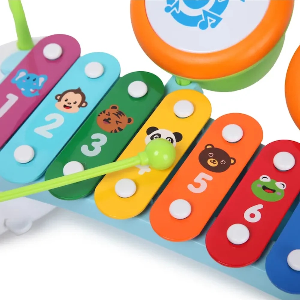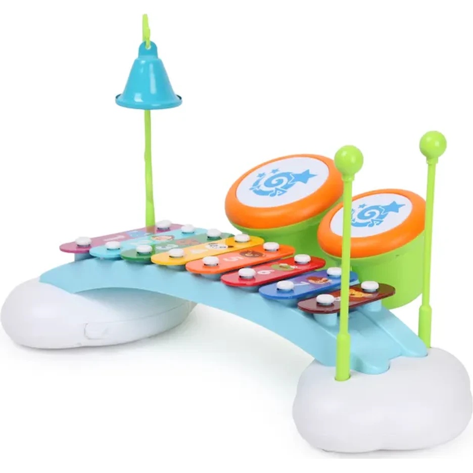 Яркие клавиши издают разные ноты при ударе палочками, позволяя детям импровизировать и тренировать слух. Кроме того, в набор входят два маленьких барабана и подвесной колокольчик для разнообразия игры.