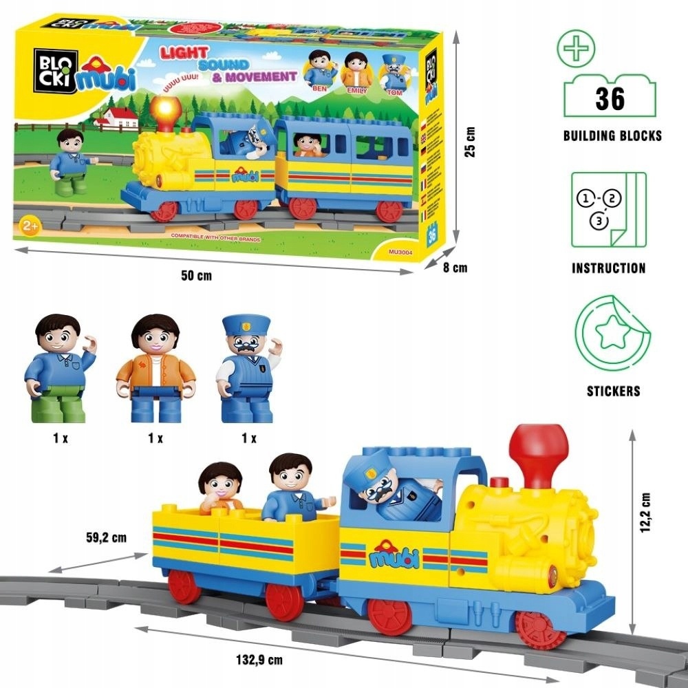 Набор кубиков MUBI BLOCKS - Веселый поезд Тома MU3004 состоит из 36 элементов, соединяющихся в чудесный желто-синий паровозик MUBI. В набор также входят 3 фигурки - инженер Том, мэр городка МУБИ - Бен и экономка Эмили. В набор также входят рельсы для поезда, к которым можно прикрепить дополнительные элементы, чтобы продлить путешествие!