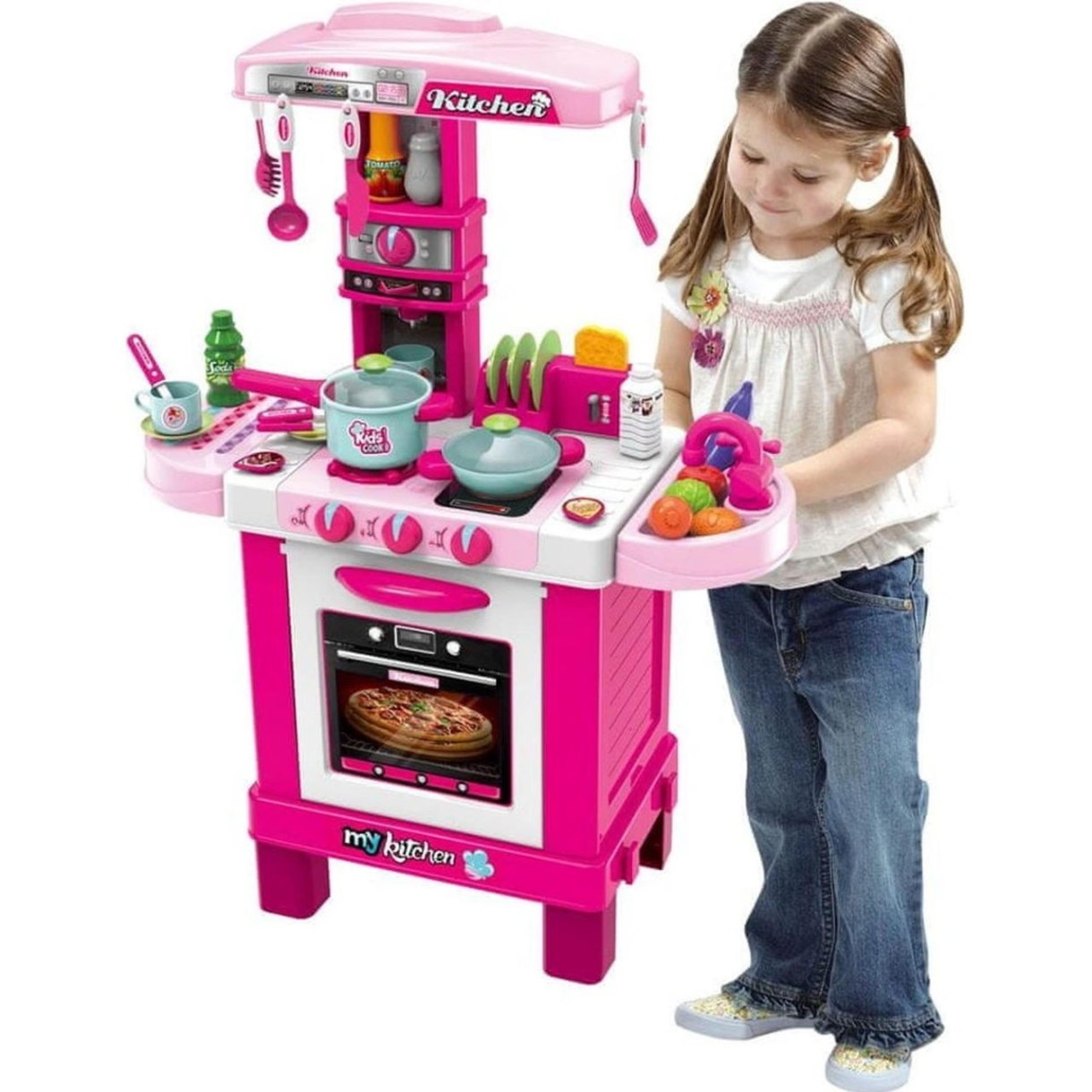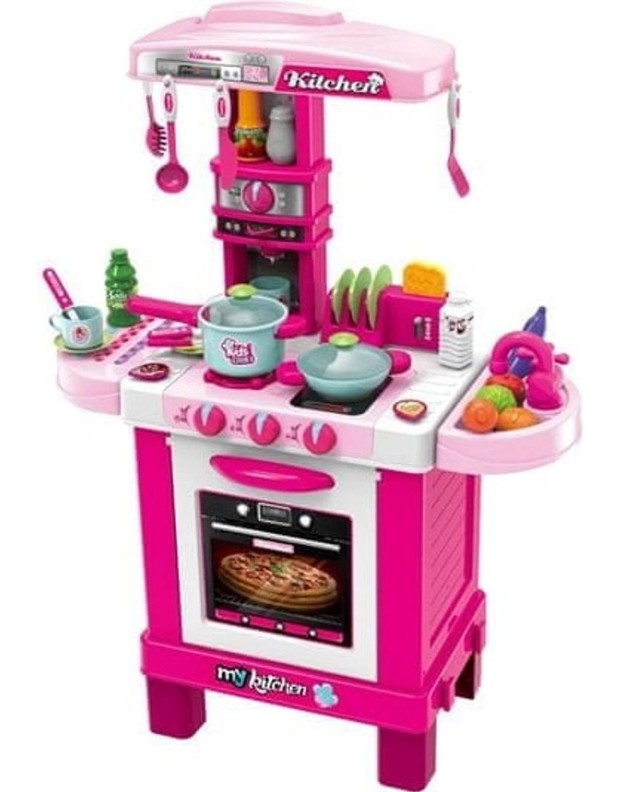 Детская кухня может помочь будущим хозяйкам освоиться на кухне и приучиться обращаться с различными кухонными принадлежностями. Кухня состоит из мойки, игрушечной плитки, овощной корзинки и держателя для посуды. Также в наборе имеются игрушечные продукты, набор посуды и другие комплектующие.Набор оснащен световыми и звуковыми эффектами, что сделает игры с ним еще интереснее. Помимо этого из крана мойки при ее включении может литься настоящая вода, что делает игру максимально реалистичной.