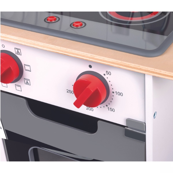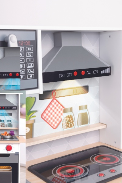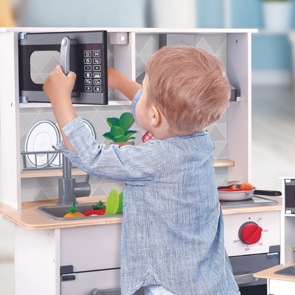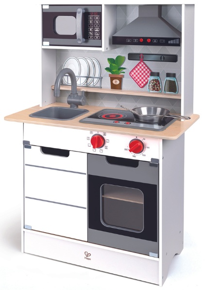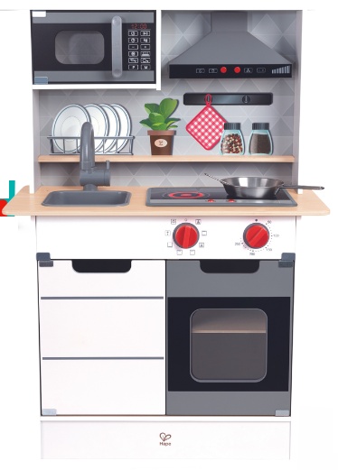 Детям понравится эта многофункциональная кухня от Hape, с множеством очаровательных приборов и функций, в том числе с регулируемой лампой-вытяжкой и звуковой микроволновой печью.