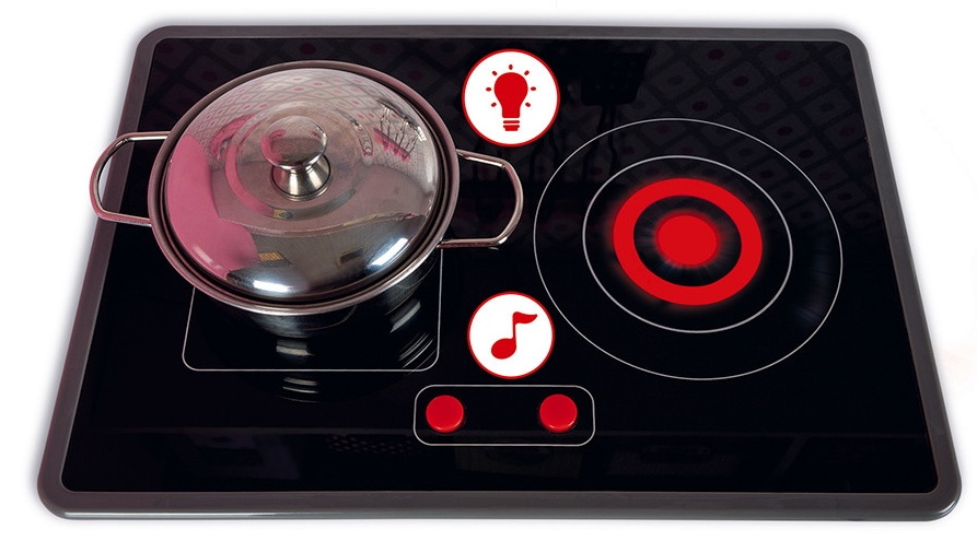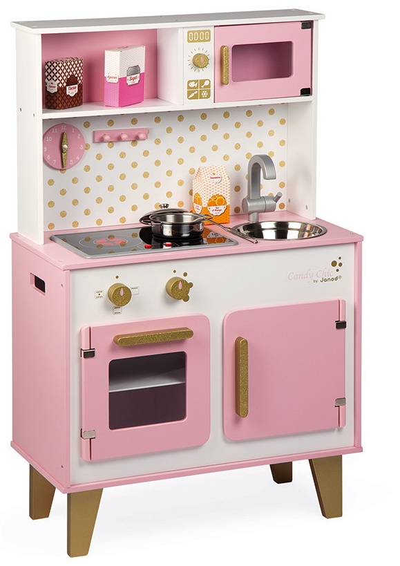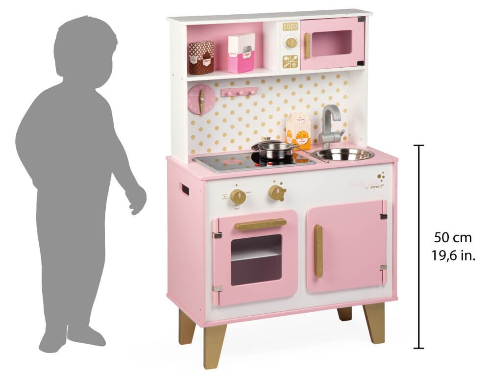 Готовить всегда одно удовольствие, поэтому Джанод предлагает вам открыть для себя большую плиту Candy Chic Big Cooker в сладких цветах конфет и сахарной ваты! Эта розово-золотая деревянная плита отправит детей в возрасте от 3 лет в страну сладких и нежных вкусов. Она прекрасно оборудована, и малыши смогут представить себя на настоящей кухне благодаря многочисленным аксессуарам: крюку для подвешивания металлического половника, металлической кастрюле с крышкой и трем картонным коробкам из-под продуктов (апельсиновый сок, какао, сахар). Вам понравится светодиодная звуковая индукционная плита! Просто нажмите красные кнопки один раз и горелки загорятся, затем второй раз, чтобы услышать звук кипящей воды. Звук и выключается автоматически через 30 секунд или при третьем нажатии красных кнопок. А чтобы превратить вас в настоящего маленького шеф-повара, вы не можете не оценить духовой шкаф с 3 вращающимися ручками со звуковыми эффектами, микроволновую печь, шкаф для хранения принадлежностей, раковину из нержавеющей стали и часы для поддержания порядка! Эта красивая плита Candy Chic идеально подходит для приготовления любимых блюд ваших детей! Высота столешницы: 50 см (19,7 дюйма).