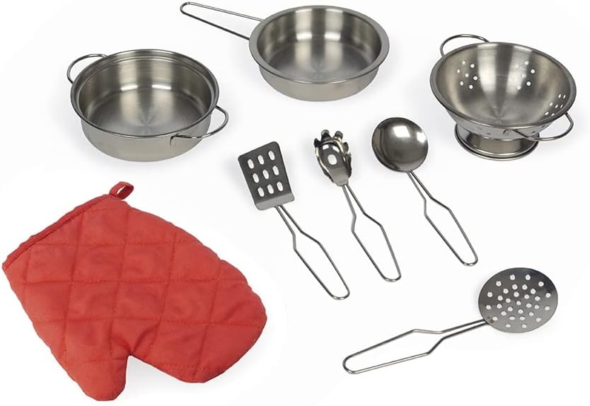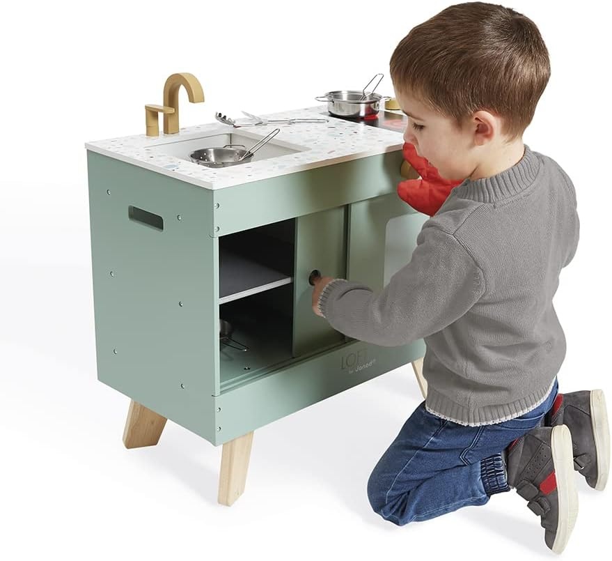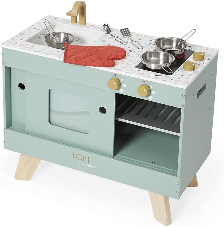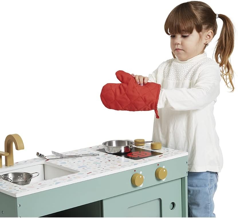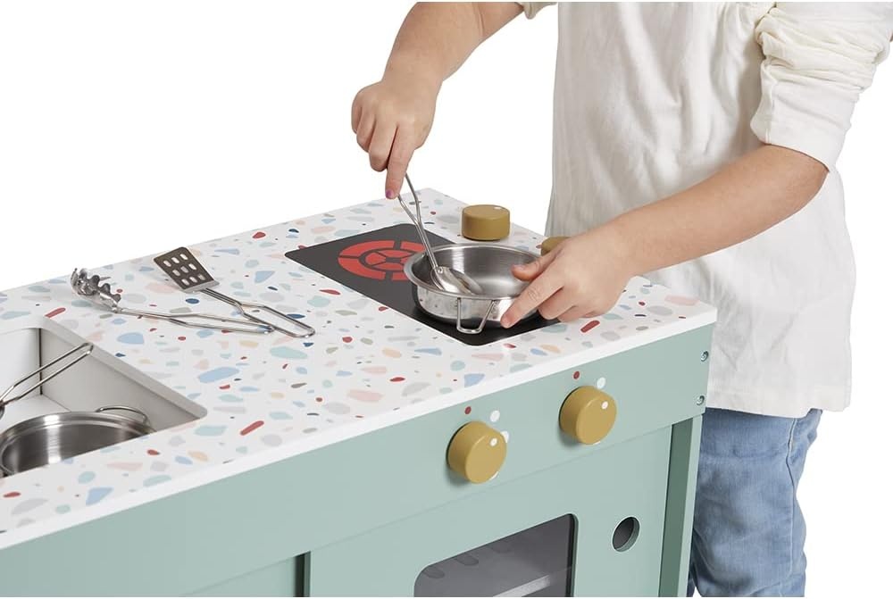 Эта деревянная кухня содержит все, что нужно маленькому повару: плита, раковина с краном, духовка, шкаф (с внутренними полками) с 2 раздвижными дверцами, 4 поворотные ручки с механическими звуковыми эффектами, 8 аксессуаров.