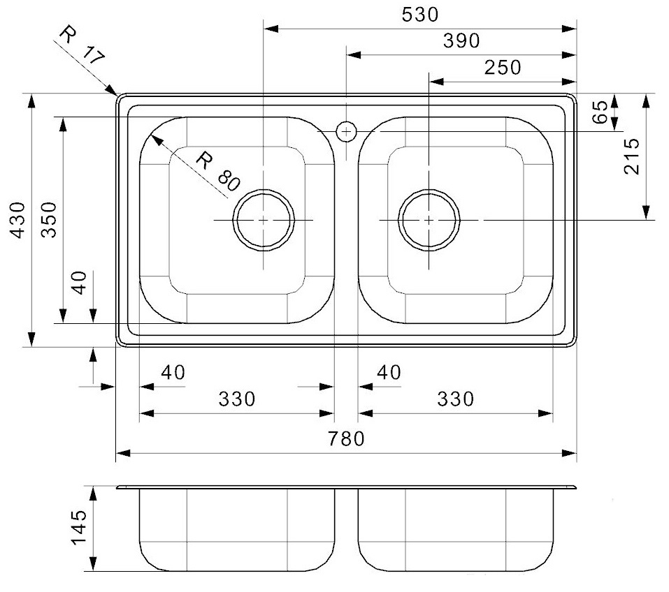 Размер мойки780x430x145 мм