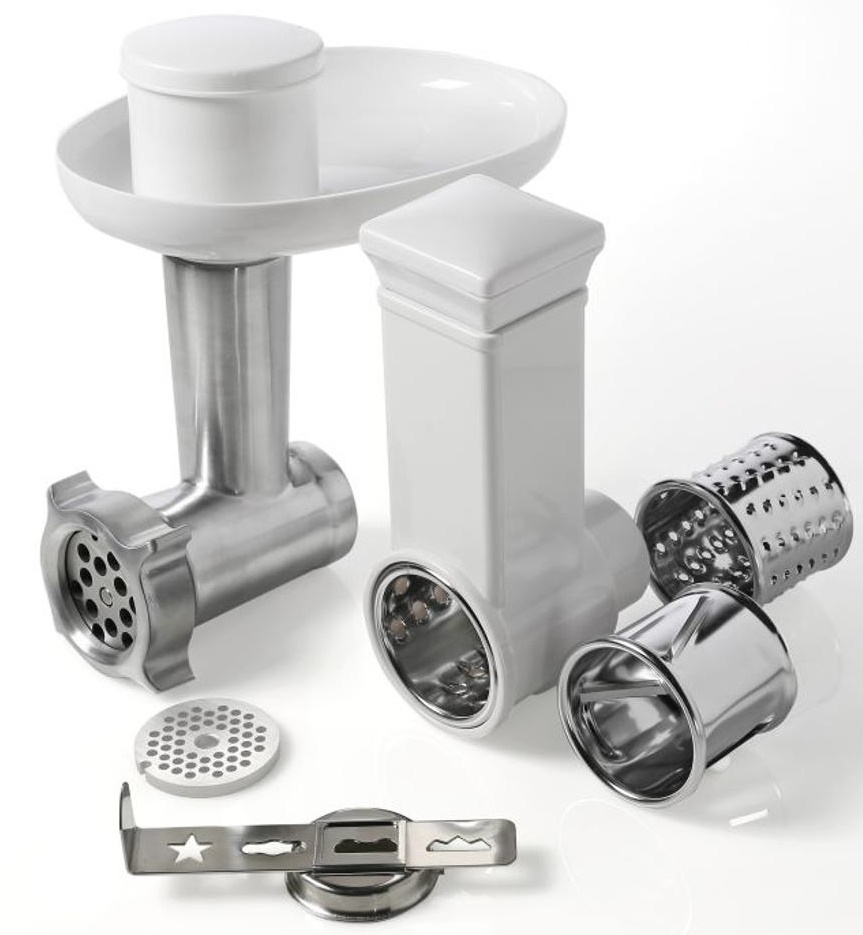 Смешивание, взбивание и вымешивание. Комплектация кухонной машины включает крюк для вымешивания теста, венчик, лопатку для смешивания и инновационную гибкую насадку. Венчик поможет в считанные минуты взбить сливки и белки в пену, крюк для теста справляется с самым тугим тестом, а лопатка используется для смешивания ингредиентов до легких, воздушных текстур, например, кремов и соусов.