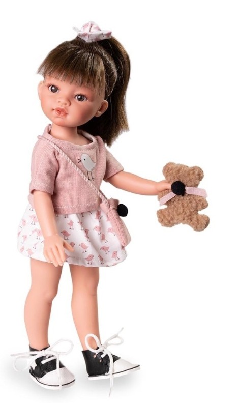 Кукла Эмили от Антонио Хуана представлена как культовая модная фигурка, идеально подходящая для детей, увлеченных ролевыми играми и последними модными тенденциями. Ее высота составляет 33 см. Эмили одета в футболку пыльного цвета с милой аппликацией в виде птички, короткую расклешенную юбку с узором и черно-белые кроссовки на шнуровке. В комплект входят сумка через плечо и плюшевый мишка.