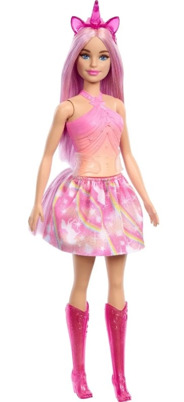 Исследуйте фантастический мир, полный приключений, вместе с этой волшебной куклой Барби из серии «Dreamtopia»! Благодаря своим пышным розовым волосам она идеально подходит для экспериментов и создания разных причесок. На ней лиф цвета заката, съемная юбка в тон и блестящие сапоги до колен. В набор входят два волшебных аксессуара для игры-трансформации. Если надеть на голову ленту и прикрепить хвост, кукла превратится в милого единорога.