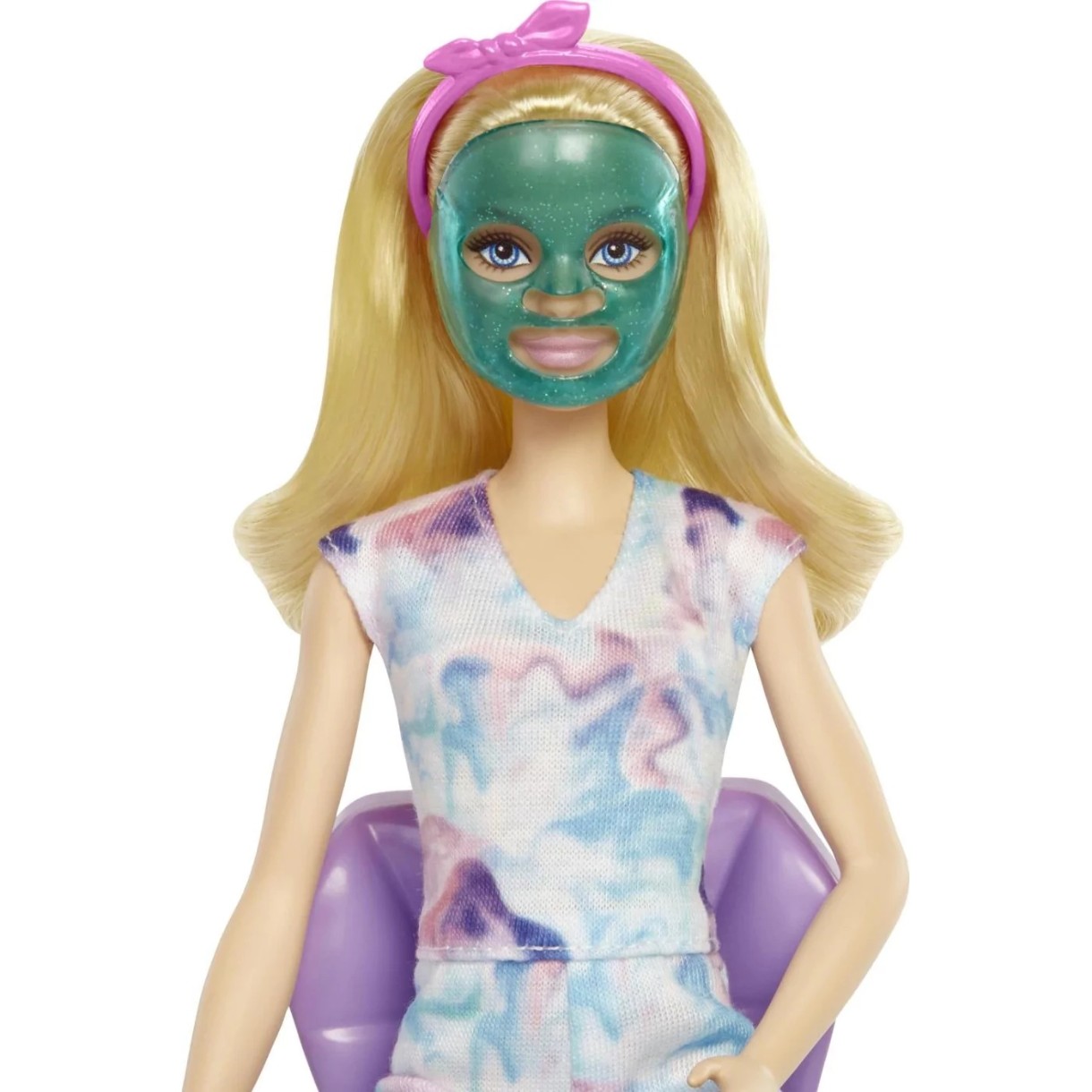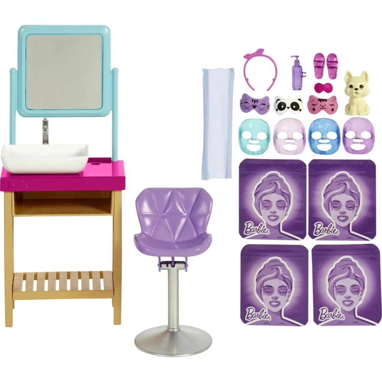 Проведите день Барби в спа-салоне с игровым набором Барби СПА-салон, где дети могут научиться ритуалам хорошего самочувствия и расслабления. Кукла Барби одета в милый комбинезон, на голове - розовая повязка. Она готова наносить спа-маски, чтобы целый день хорошо себя чувствовать и расслабляться. Как только игра закончится, поместите маски для лица в закрывающиеся пакеты с тематикой Барби (как дома) для повторной игры и храните в туалетном столике. Включает в себя куклу Барби, щенка с маской для глаз, раковину и зеркало, кресло с откидной спинкой, полотенце, 4 маски для лица, 4 закрывающихся сумки, 3 маски для глаз с изображением животных, бутылочку с лосьоном, тапочки и повязку на голову. Кукла не может стоять без опоры.