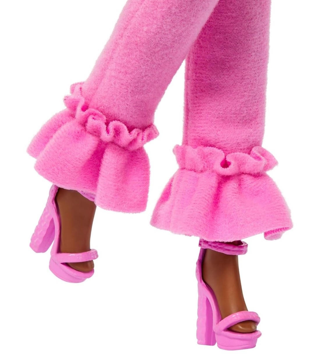 Она демонстрирует характер Барби в мягком наряде из двух частей с эффектным воротником из искусственного меха. Ее босоножки на каблуках подчеркнуты пышными манжетами на брюках!