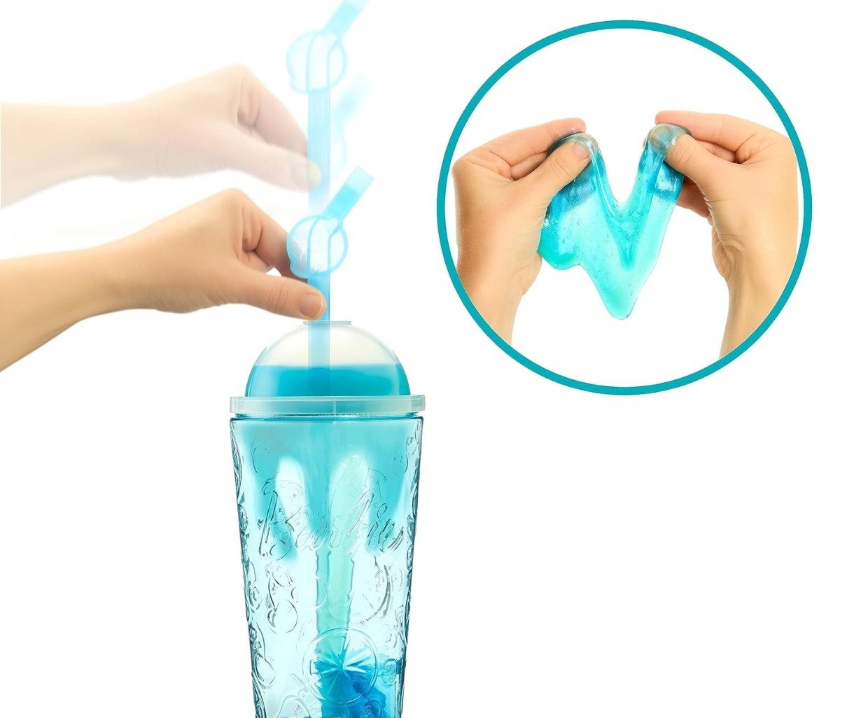 чашка со слизью и соломинкой, ароматизированный сквиши-питомец, пара шорт, пара роликовых коньков, фруктовое кольцо, сквиши-мини-напиток