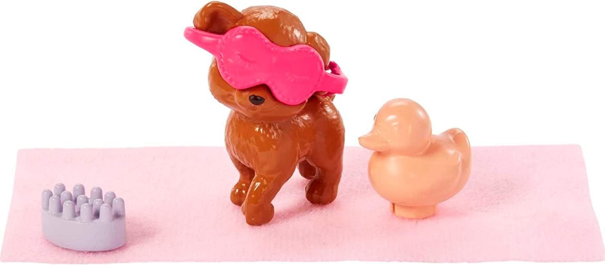 Пора расслабиться в spa-салоне вместе с Барби после тяжёлого рабочего дня! Барби одета в нежно-розовый халат с лимонным принтом и розовые сланцы. На голове стильный розовый ободок. В наборе есть все необходимые аксессуары, для проведения процедуры: полотенце, массажёр, щётка для тела, ванночка для ног, ароматизированное мыло, свечи, уточка для ванны, повязка на глаза и фен. Вместе с Барби её любимый щенок со своей собственной повязкой на глаза.