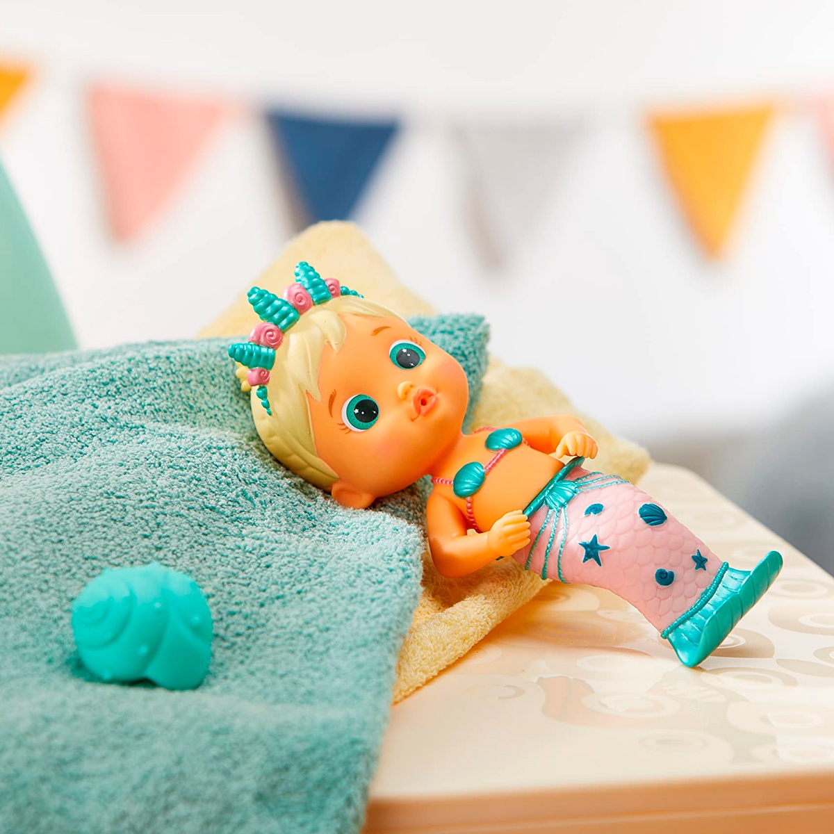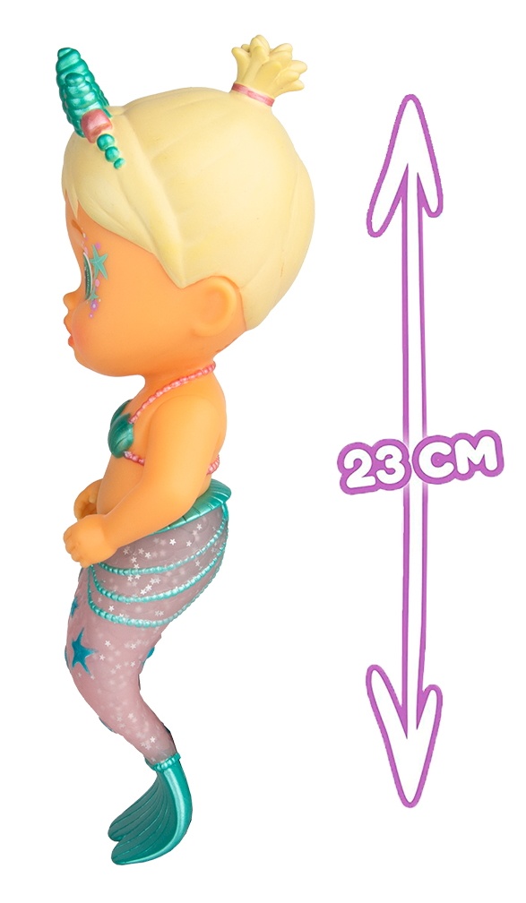 У куклы красивый перламутровый хвостик с блесточками и очаровательная тиара.