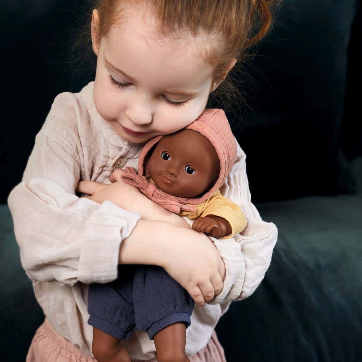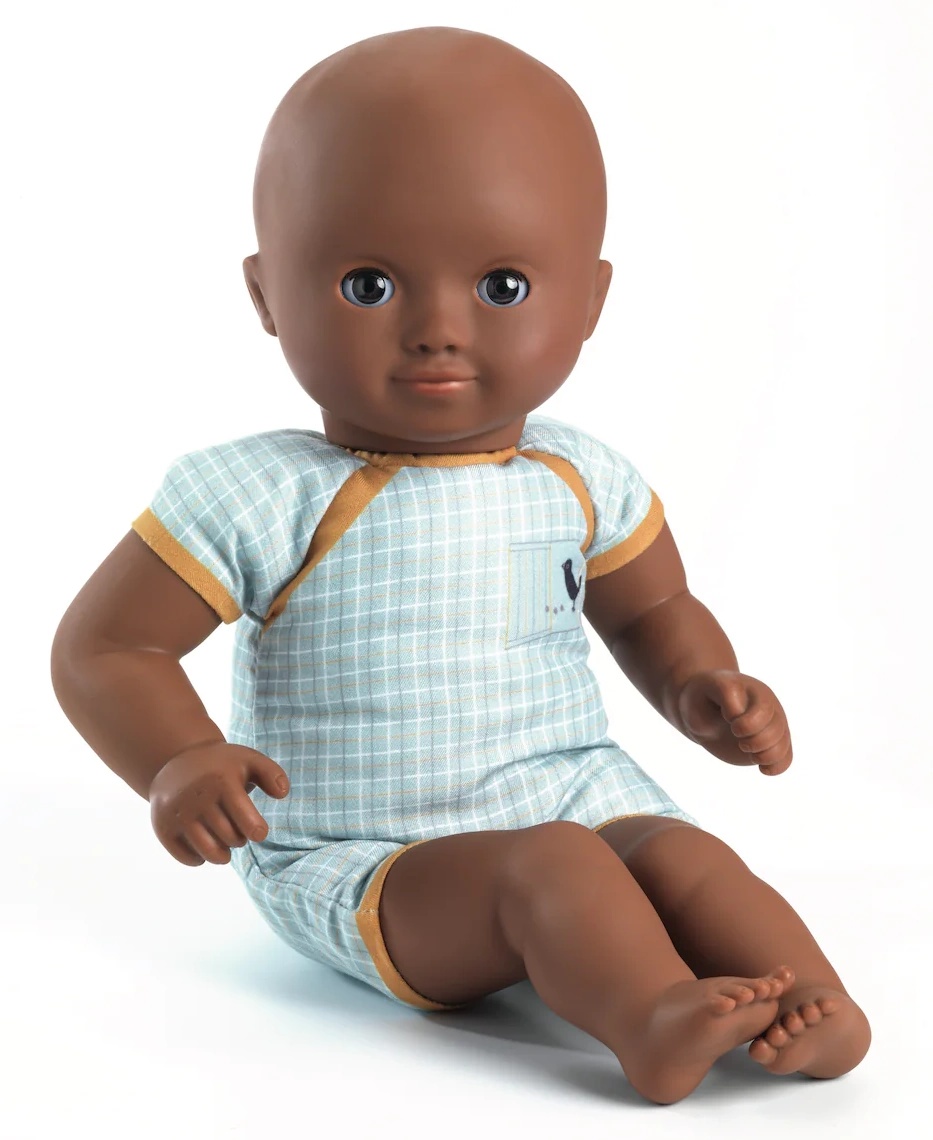 С красивыми черными глазами и соответствующим нарядом Baby Mimosa — кукла для детей от 18 месяцев. Он легкий, а его размер (32 см) идеально подходит для детских объятий. Его гибкое тело украшено красивым боди и позволяет ему принимать положение настоящего ребенка. Его лицо, руки и ноги сделаны из очень мягкого винила, приятного на ощупь. Его сонные глаза закрываются, когда его кладут на спину. Эта куколка одета в штаны, рубашку и чепчик из 100% хлопка.