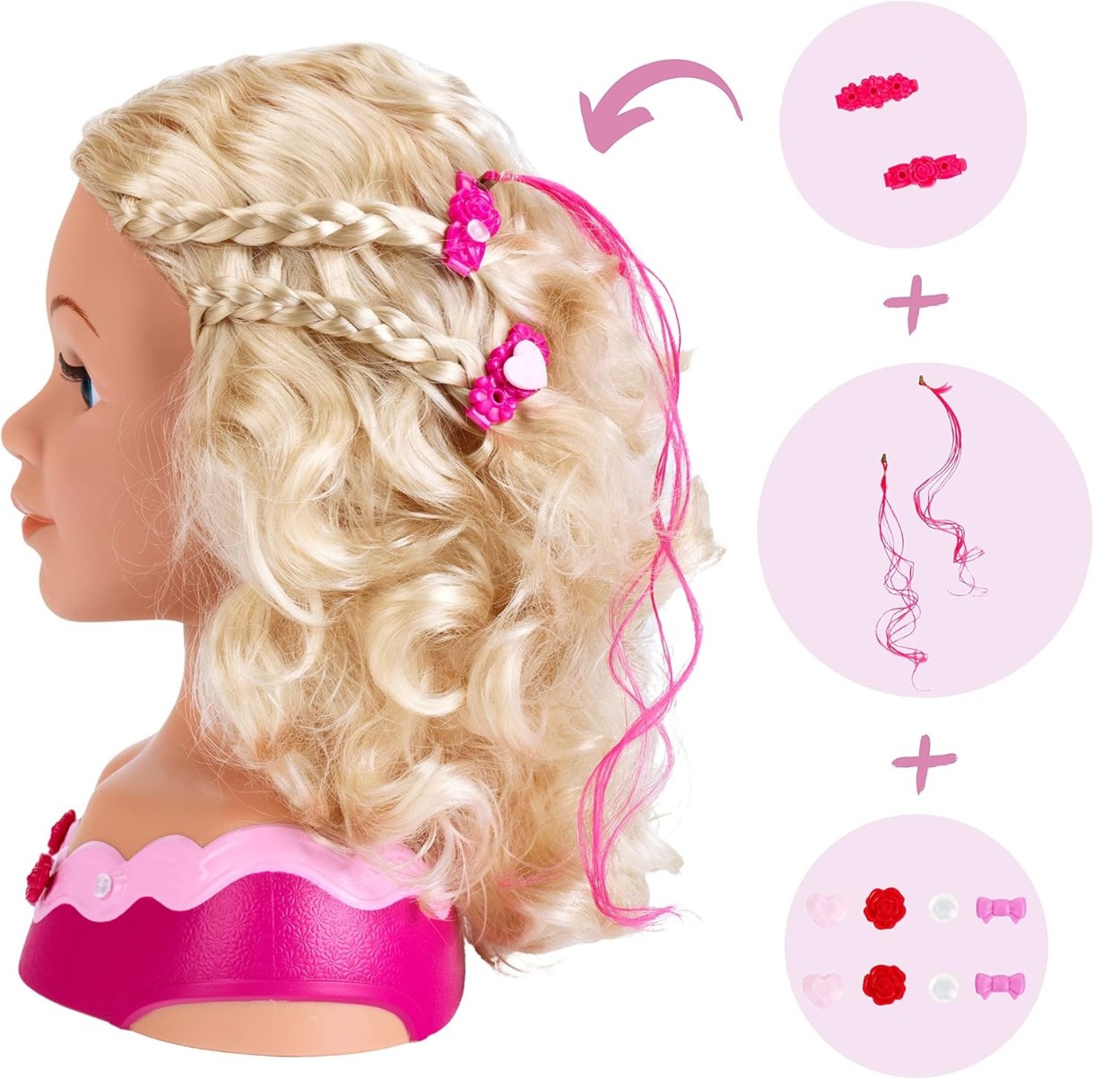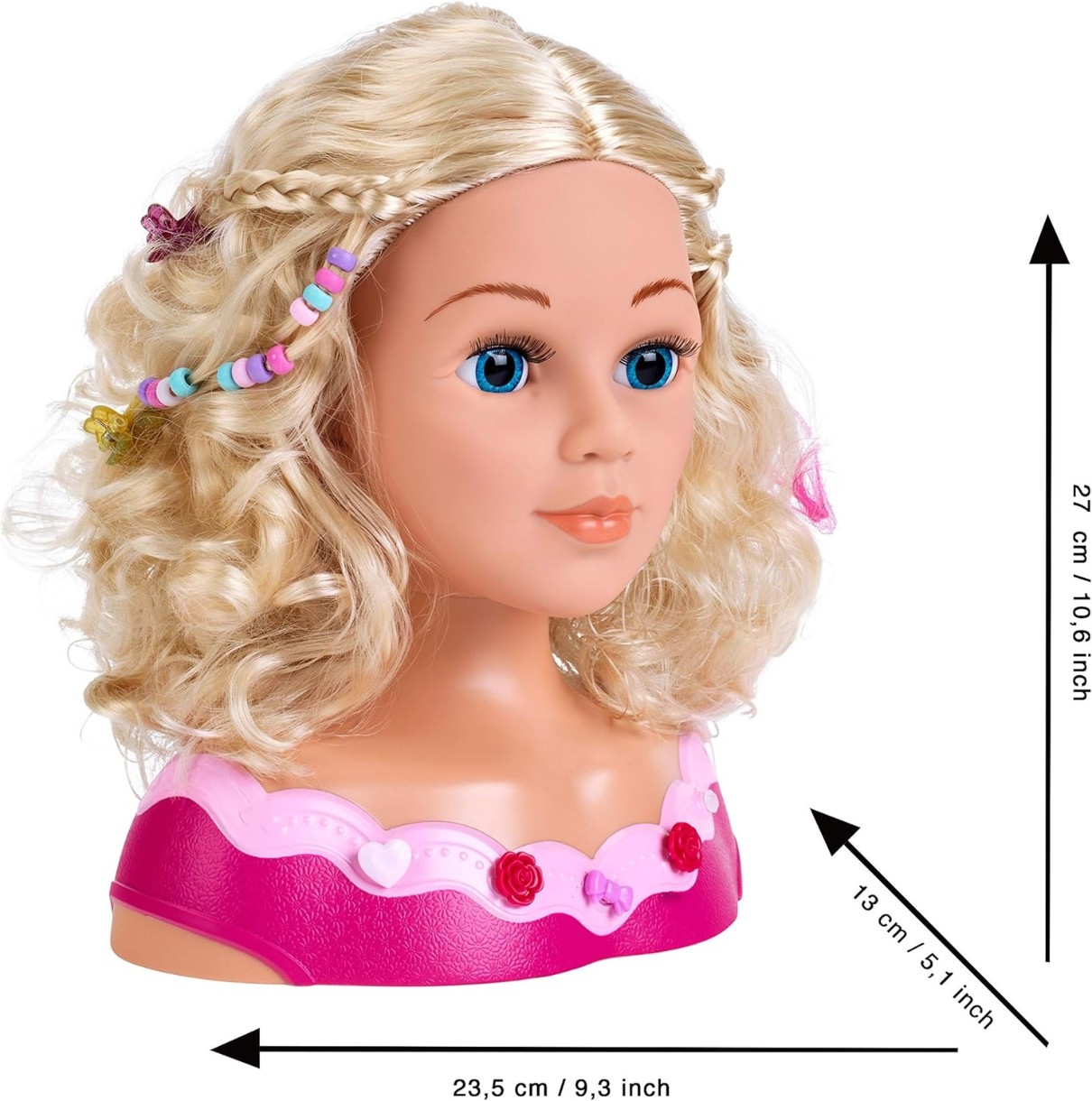Головка для укладки высотой 27 см идеально подходит для начинающих парикмахеров и визажистов, длинные волосы можно расчесывать, укладывать и мыть сколько угодно. Блеск для губ, тени для век и румяна дерматологически протестированы, а шикарные аксессуары, такие как заколки для волос, жемчуг и пряди, всегда в моде. Даже туловище насадки для укладки можно сделать действительно шикарной с помощью любящих аксессуаров, таких как булавки и наклейки. Двигательные навыки и креативность тренируются путем нанесения макияжа, расчесывания и расчесывания, а также прикрепления заколок и зажимов для волос