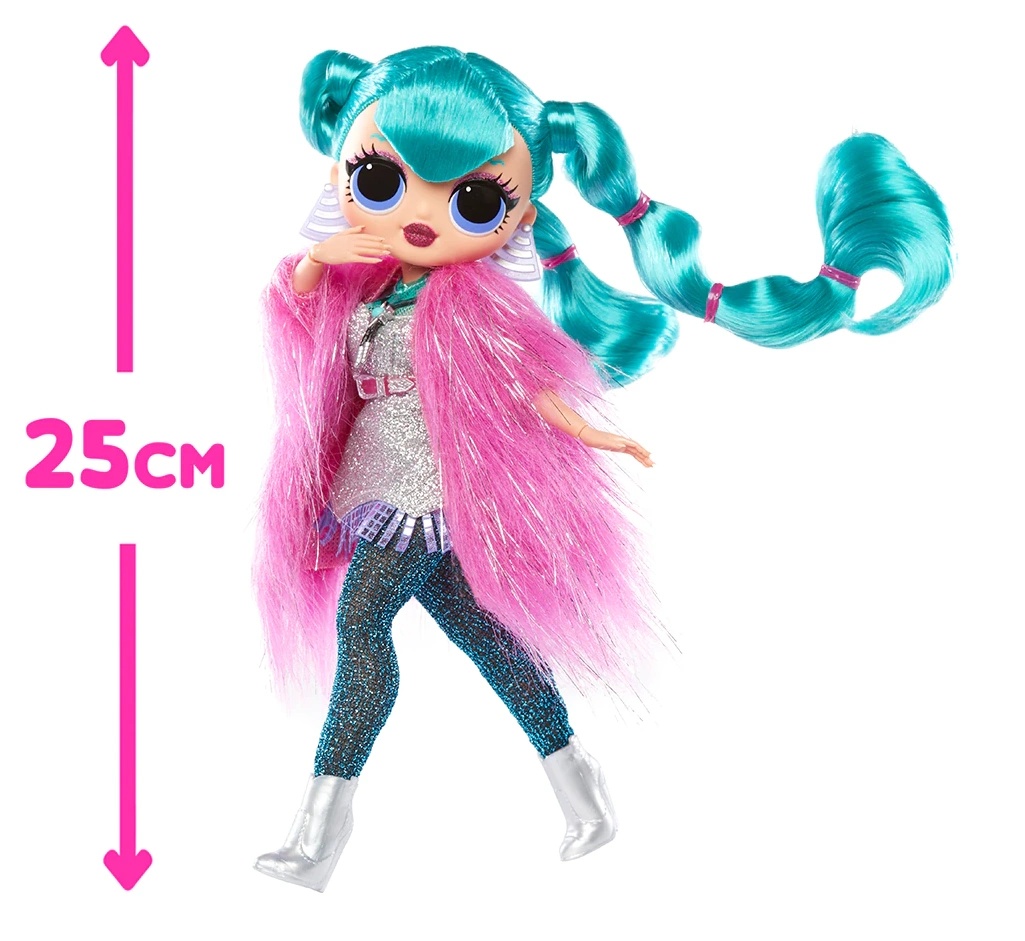 Модная куколка серии «O.M.G.» Космическая звезда - яркая и интересная малышка! У нее настолько необычный стиль, будто она прибыла с другой планеты! Она обожает создавать новые тренды в моде и удивлять окружающих! Большая и яркая куколка высотой 27 см, модная одежда, шикарные волосы, стильные аксессуары. Много сюрпризов при распаковке кукол L.O.L. Surprise! серии «O.M.G.». Кукла имеет шарнирные руки, что дает возможность придумывать еще больше интересных сценариев для игры. Подставка для куклы может быть как подставкой, так и стульчиком.