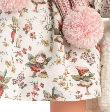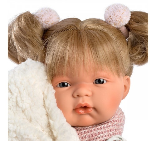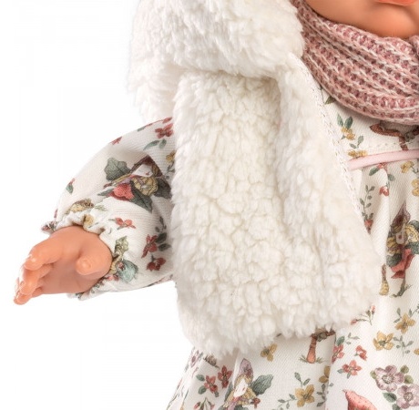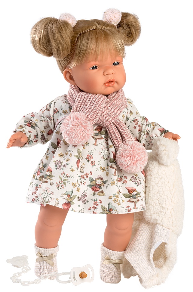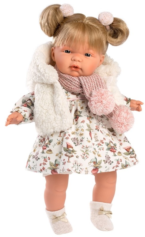 Плачущая кукла Джоэль ростом 38 см была одета в белое платье, розовый шарф с помпонами, белые носки и меховую жилетку. Ее светлые волосы были собраны в два симпатичных хвостика. Круглое лицо, крошечные ушки, нос и рот делают куклу похожей на настоящего младенца. Ее любимая соска очень важна для нее, поэтому, когда мы ее возьмем, она будет плакать и звать маму, пока. Кукла упакована в декоративную картонную коробку. Мы любим испанских кукол Llorens!