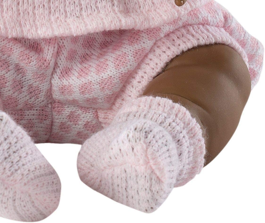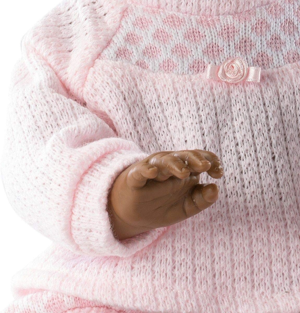 Куклы из последней коллекции испанской мануфактуры Llorens выглядят как настоящий ребенок и являются идеальной игрушкой для детей всех возрастов. Производитель позаботился о деталях натуралистического внешнего вида, таких как пол, складки и выражения лица, что делает этих кукол похожими на настоящего ребенка. Малышка высотой 45 см выполнеа исключительно из тонкого,мягкого и приятного на ощупь винила. Куклу можно купать! Ручки и ноги подвижны. Кукла имеет темную кожу. Она носит трикотажный розовый свитер и шорты. В комплект также входит милая шапочка с помпоном и носки. Кукла упакована в элегантную коробку, идеально подходящую для подарка.
