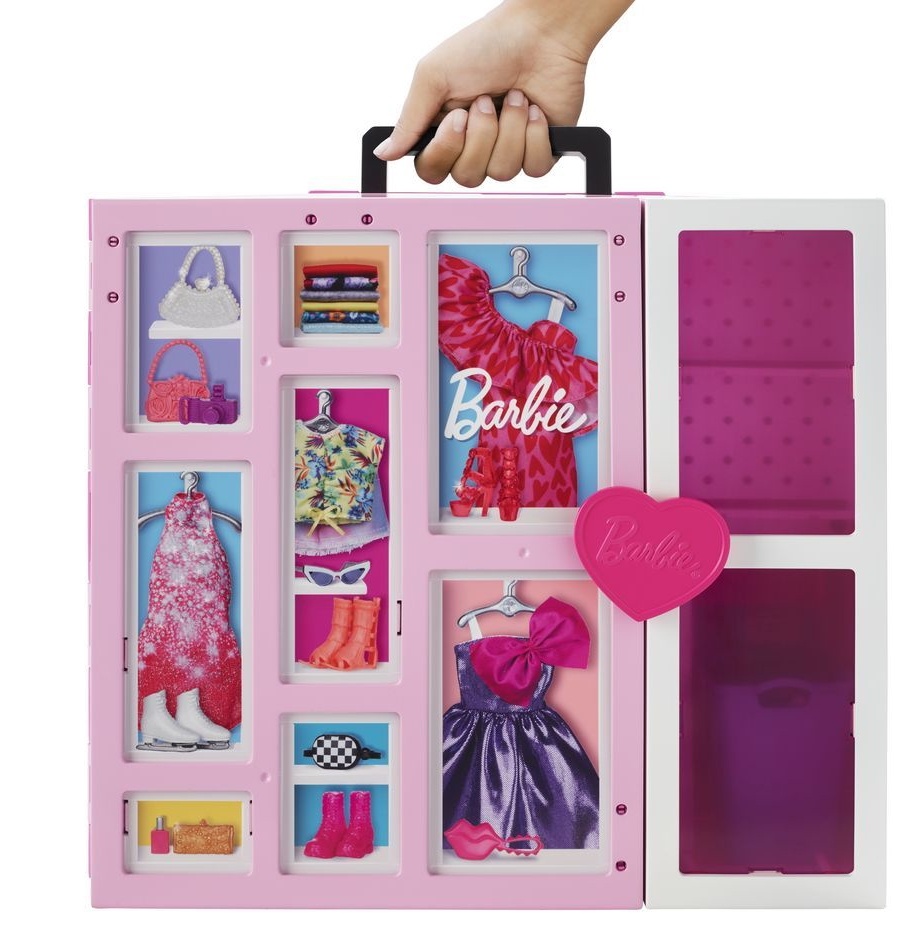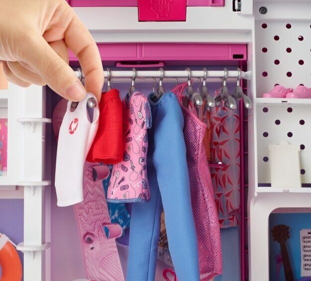 Гардеробная Барби представляет собой современный розовый шкаф, в котором есть более 10 мест для хранения одежды и модных аксессуаров, в том числе выдвижное пространство, образующее второй уровень, желоб с корзиной для белья, большое зеркало и стол. Создавать новый образ легко и приятно благодаря зеркалу и быстрому доступу к одежде, висящей на вешалках. После того, как вы выбрали наряд, поставьте свою куклу Барби на подставку, чтобы завершить образ и посмотреть, как модно она выглядит в большом зеркале. Бросьте поношенную одежду в лоток для белья и используйте стол, чтобы сделать истории еще более разнообразными.