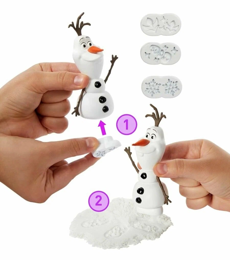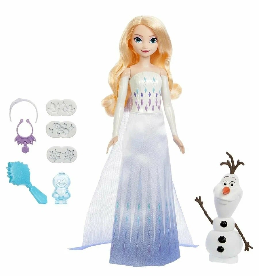 Набор, вдохновленный мультфильмом Холодное сердце включает в себя куклу Эльза и фигурку Олафа, который может превращаться в штамп. Дети смогут прикрепить 4 разных штампика к нижней части Олафа и сделать печати на «снегу» или сделать фигурку из песка с помощью формочки дружок-снежок (белый песок для лепки идет в комплекте). Наследница престола из королевства Эренделл представлена в своем классическом наряде со съемной юбкой с накидкой, дизайн которого вдохновлен ее платьем из мультипликационного фильма Frozen. Дополняют образ изящные туфельки, ободок и ожерелье. Густые длинные волосы можно расчесывать и укладывать в стильные прически с помощью расчески, которая идет в комплекте.