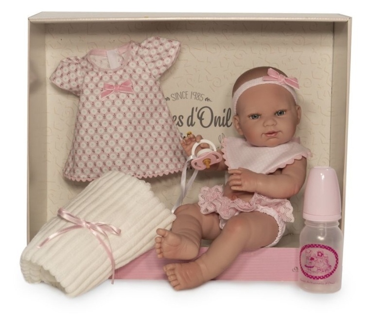 Девочка полностью виниловая, все части тела подвижны, с анатомическими половыми признаками.Кукла имеет легкий аромат ванили. С прорисованными волосами на голове. По всему телу имеются складочки, как у настоящего ребёнка.Акриловые серые глазки, обрамлены длинными ресницами ( глазки не закрываются ). Одета - розовые трусики, розовый слюнявчик, на голове повязка. В комплекте соска (вставляется в ротик), бело-розовое с рисунком платье, белое одеялко, бутылочка для кормления. Одежда вся снимается.