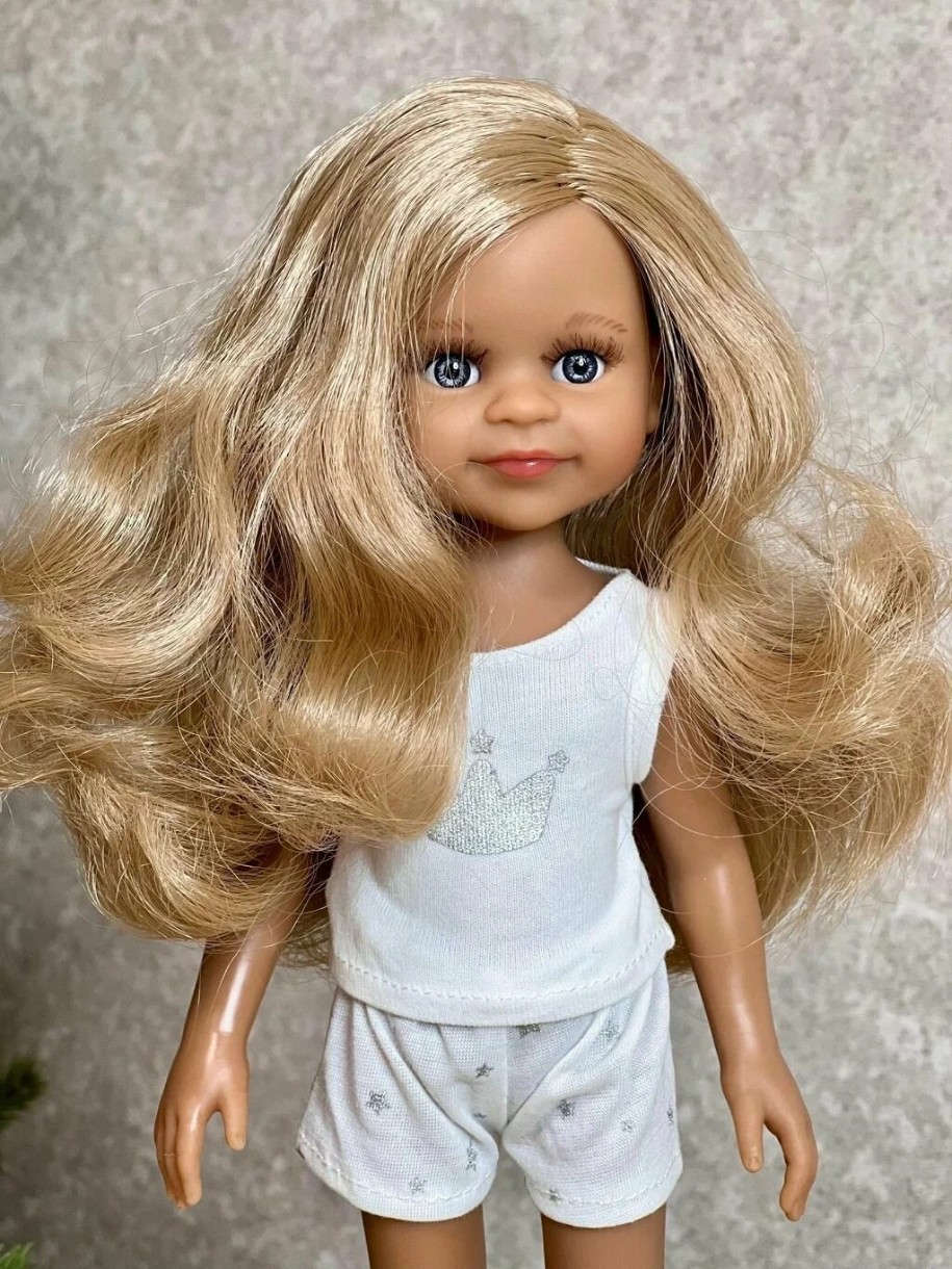 Кукла от фабрики PAOLA REINA. Кукла Симона из серии Подружки в пижамах, полностью виниловая девочка мулатка. Все части тела подвижны. Без анатомических половых признаков. Кукла имеет нежный аромат ванили. Уникальный и неповторимый дизайн лица и тела, ручная работа (ресницы, щечки, губы, прическа). Девочка с русыми волосами (не парик, прошивка по всей голове), волосы из высококачественного нейлона, волнистые. Серые, акриловые глазки (не закрываются), с длинными ресницами. Одета - пижама. Одежда вся снимается. Рост 32см. Упаковка - фирменный пакет (без подарочной коробки).