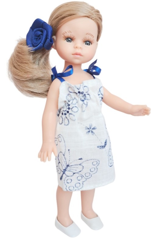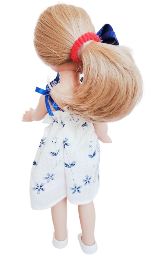 Интересная, легкая и воздушная малышка с синей розочкой в волосах и летним платьем на бретельках. Белые балетки на ногах идеально дополняют образ, легко снимаются, но не слетают просто так. Кукла выполнена из качественных и безопасных материалов: тело — винил с ароматом ванили, волосы — прочный нейлон.