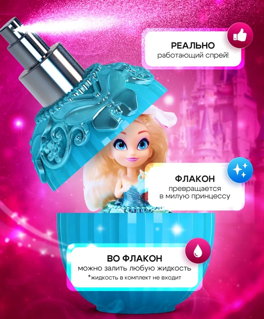 Смотри как изысканный флакон превращается в милую принцессу. У куклы густые волосы, нарядное блестящее платья и сумочка в комплекте.