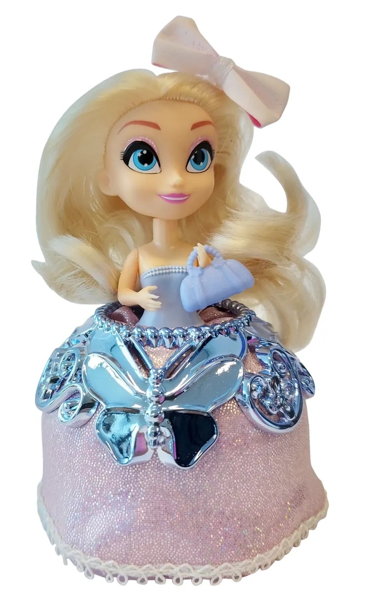 Смотри как изысканный флакон превращается в милую принцессу. У куклы густые волосы, нарядное блестящее платья и сумочка в комплекте.