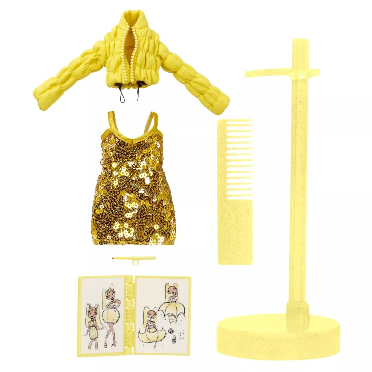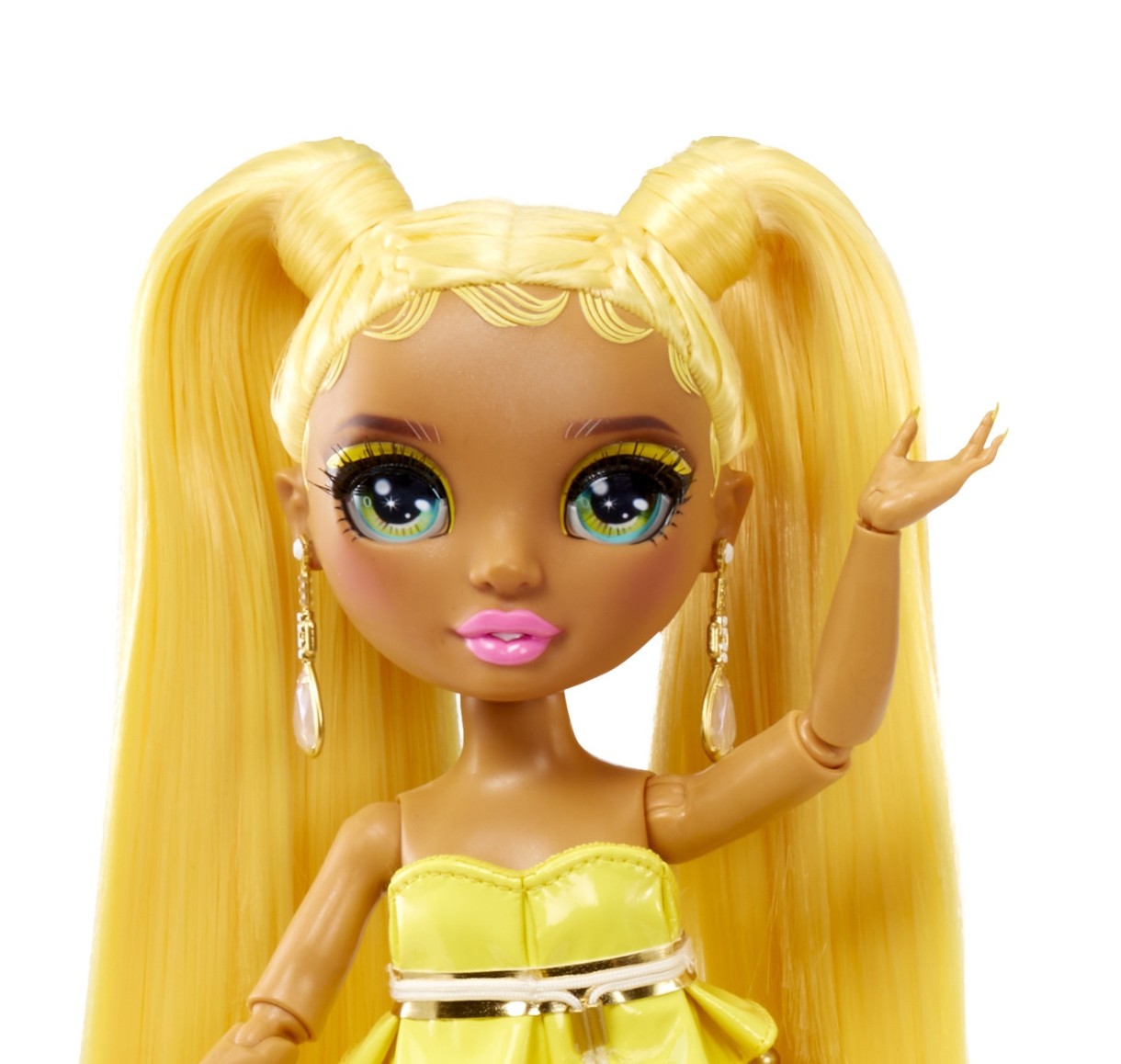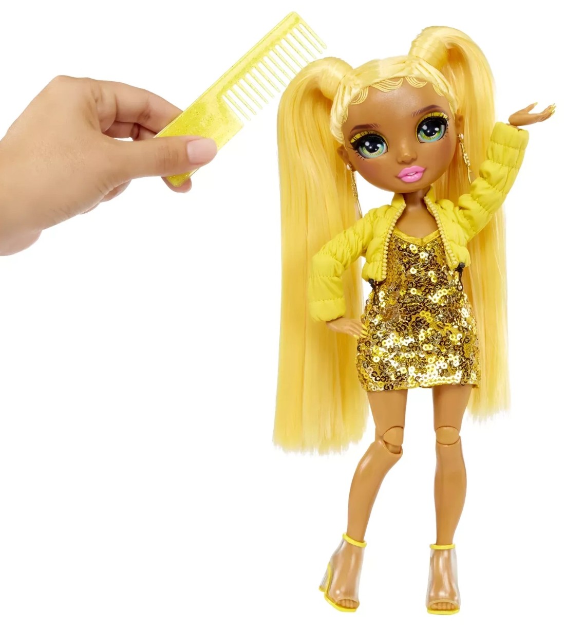 Модная кукла Санни Мэдисон (Желтая) всегда весела и полна энергии, что она подчеркивает своим нарядом. На девушке желтое платье, напоминающее перевернутый зонтик, и прозрачные туфли на высоком каблуке. Ее второй наряд — короткое платье с золотыми пайетками и короткая куртка-пуховик в тон. Позитивно!