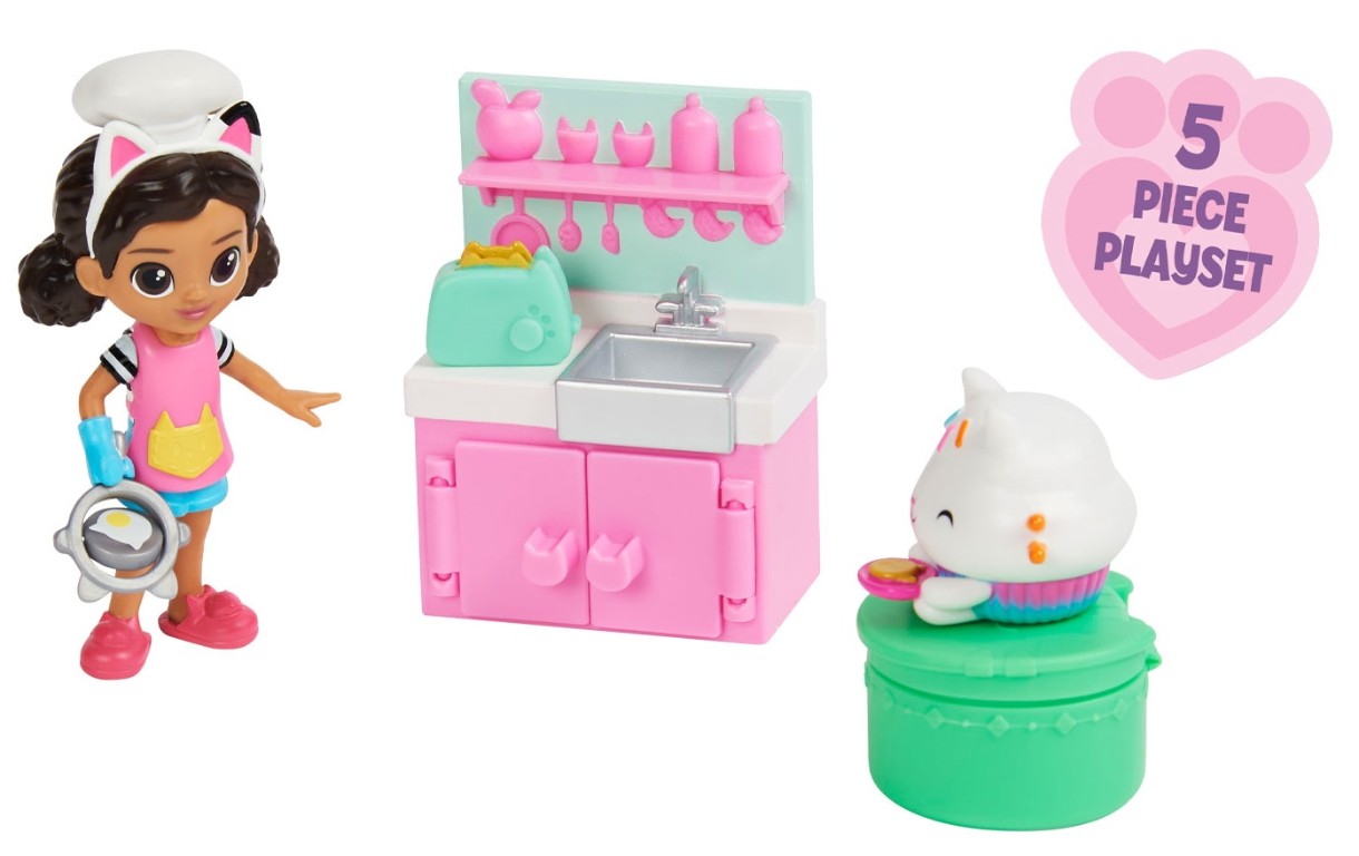 Приготовьте кулинарный шедевр вместе с Габби! В этот забавный набор входит фигурка Gabby Girl высотой 9 см, фигурка Cakey Cat, 1 кухонная раковина и многое другое. Нажмите на очаровательные кошачьи уши Габби, чтобы перевернуть сковороду и помочь ей с работой на кухне. Затем помоги Габби вымыть посуду в раковине и найди работающие кухонные шкафы — они действительно открываются и закрываются! Эта детская игрушка станет отличным подарком для детей от 3 лет и старше. Ее можно использовать с кукольным домиком Gabby's Purrfect - Large Cat House (продается отдельно).