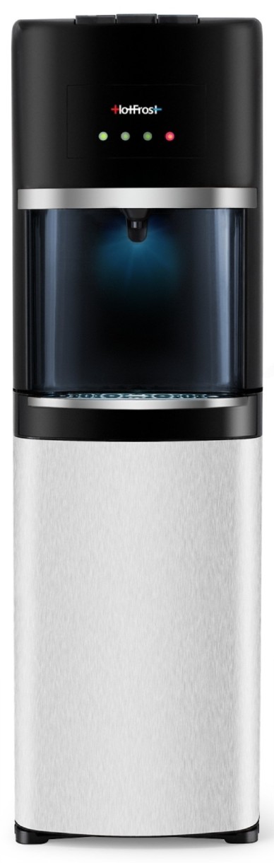 Кулер для воды HotFrost 35AN напольного типа идеально подходит для офисов, гостиниц и других помещений с большим количеством пользователей. В кулере используется компрессорный тип охлаждения. Более высокая мощность нагрева делает этот аппарат гораздо производительнее, ведь он способен нагревать до 5.5 литров воды в час. Отличительной особенностью и явным преимуществом этого кулера является нижняя загрузка бутыли. Бутыль с питьевой водой устанавливается в шкафчик, на горлышко бутыли надевается встроенный сифон с заборной трубкой. Аккуратные краники типа «нажим кружкой», они очень эргономичный и удобны тем, что для набора воды требуется только одна свободная рука (в которой находится чашка).