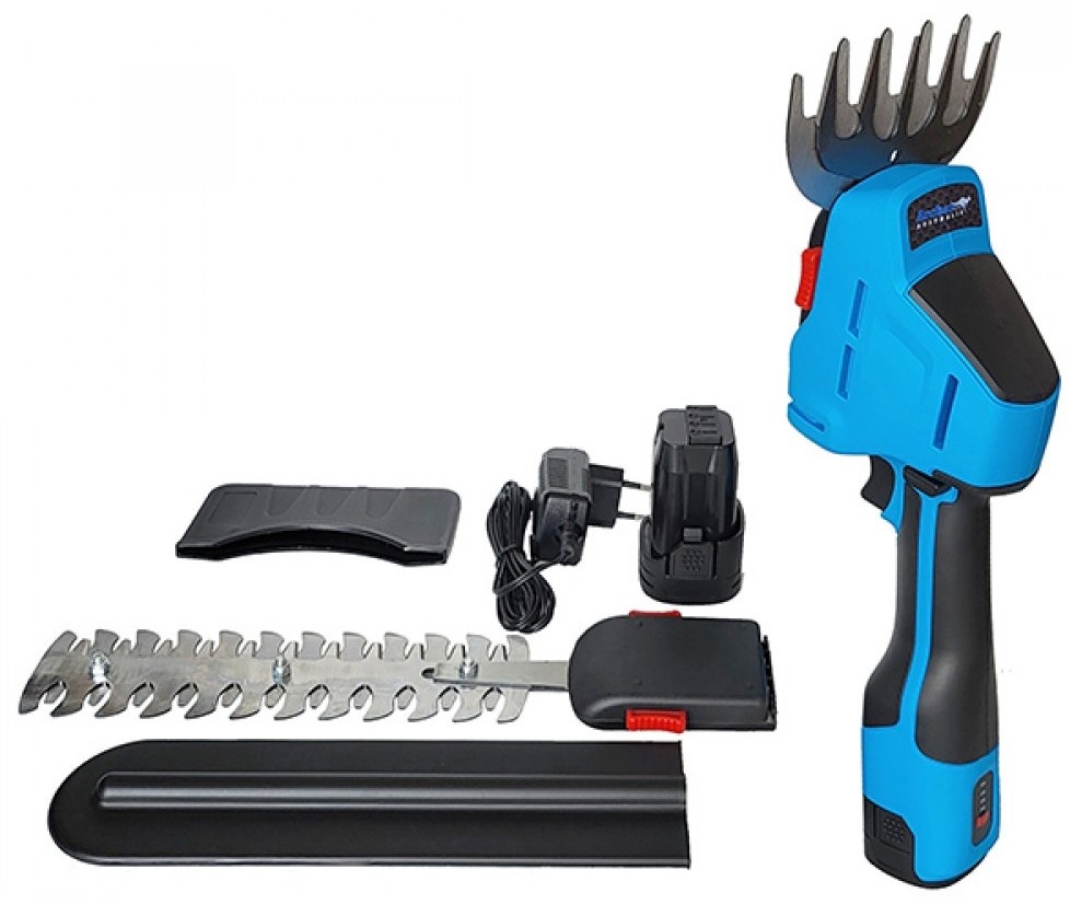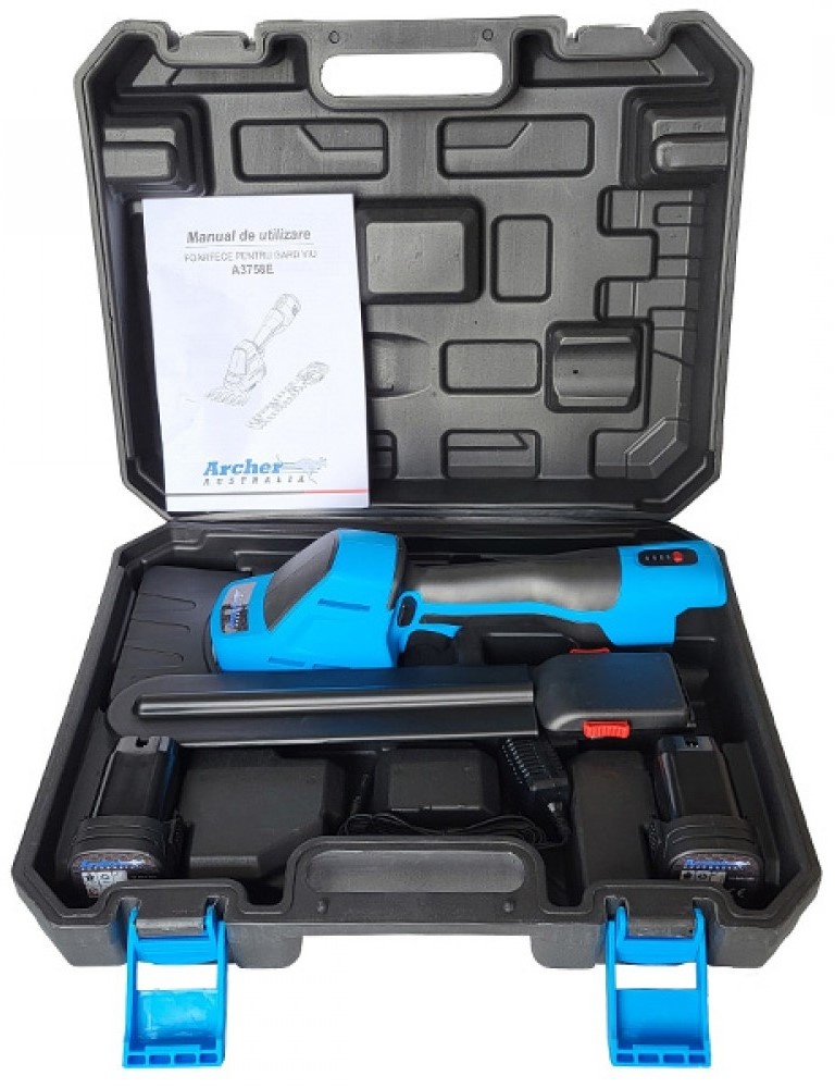 Комплект поставкизарядное устройство, чехол из пластика для ножей, лезвие для травы, лезвие кустарников, 2 аккумулятора, пластиковый чемодан