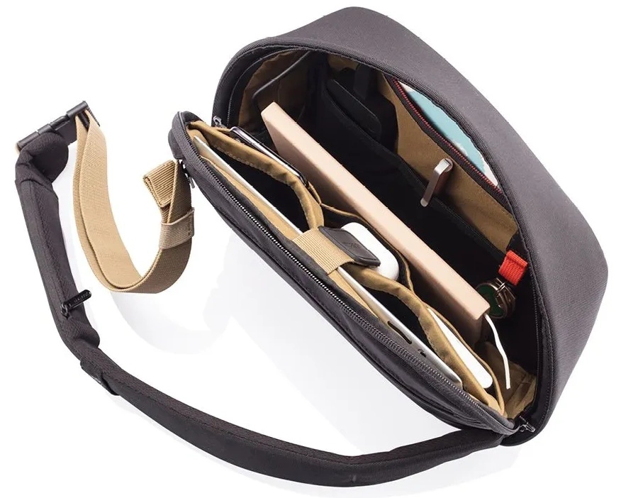 Bobby Sling, как и другие рюкзаки бренда, оснащен многоступенчатой защитой от краж. Он изготовлен из непрорезаемой ткани, а его молния скрыта от посторонних глаз.