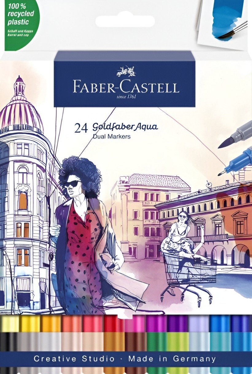 Набор двухсторонних маркеров Goldfaber Aqua от Faber-Castell 24 цвета. Многофункциональный акварельный маркер Goldfaber Aqua Dual – идеальный компаньон в вашем творческом путешествии и поможет вам достичь новых направлений в области творчества.