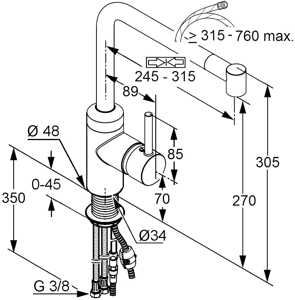 — выдвижной, телескопический, поворотный излив (220°) с возможностью горизонтального удлинения от 245 до 315 мм.