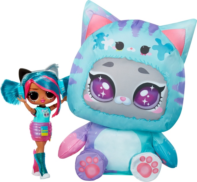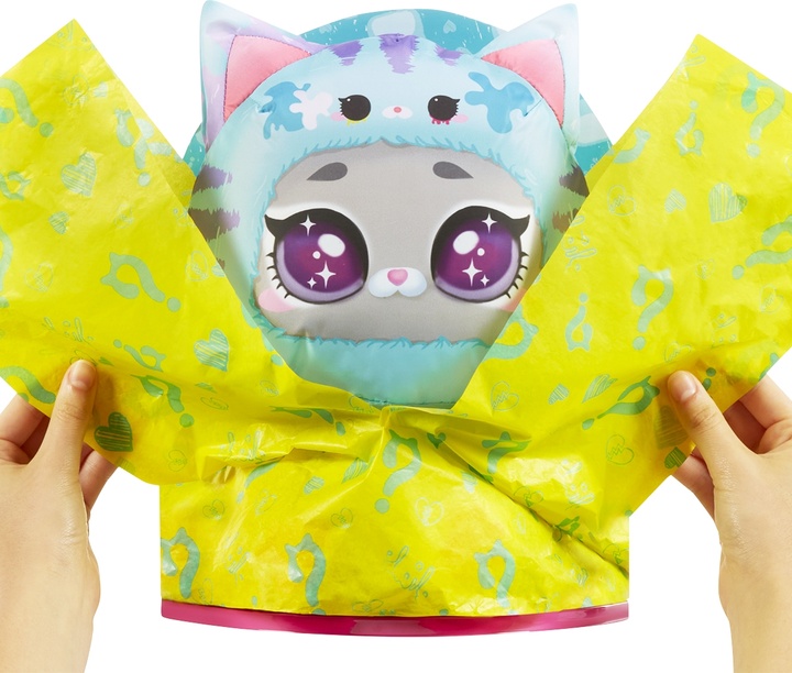 Сюрприз на этом не заканчивается! Расстегните липучку на затылке котенка, чтобы найти чудесную куклу Эмму Эмо, спрятанную внутри.