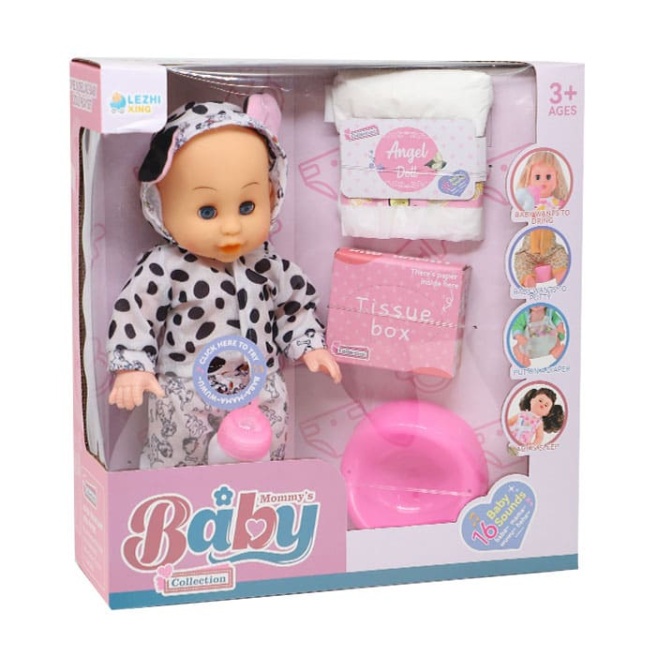 Этот пупс выполнен из прочного и легкого пластика, а также умеет издавать звуки настоящего ребенка. Также игрушка умеет закрывать глаза, пить из бутылочки и ходить на горшок. В комплекте с пупсом идет горшок, бутылочка и подгузники.