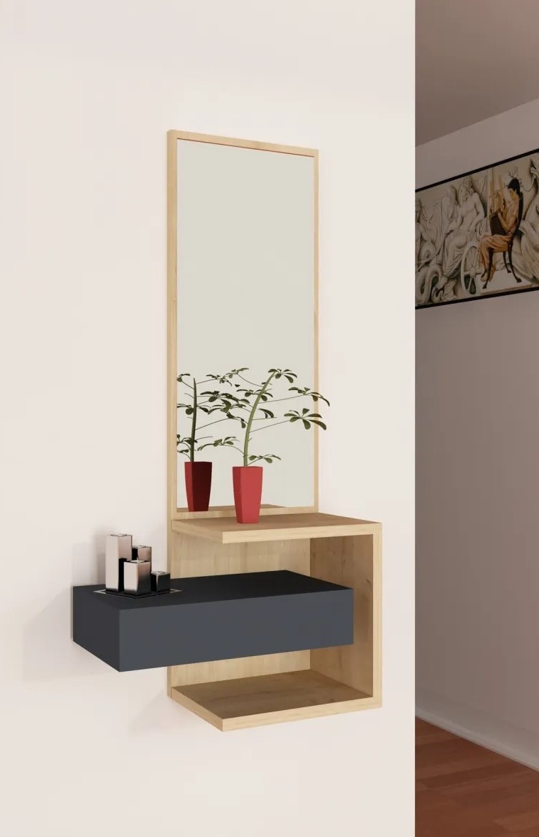 С многочисленными полками и вместительным ящиком шкаф обеспечивает достаточное место для хранения повседневных вещей. Здесь удобно хранить ключи, очки и другие мелкие предметы. Встроенное зеркало добавляет практичность, позволяя быстро проверять внешний вид перед выходом.