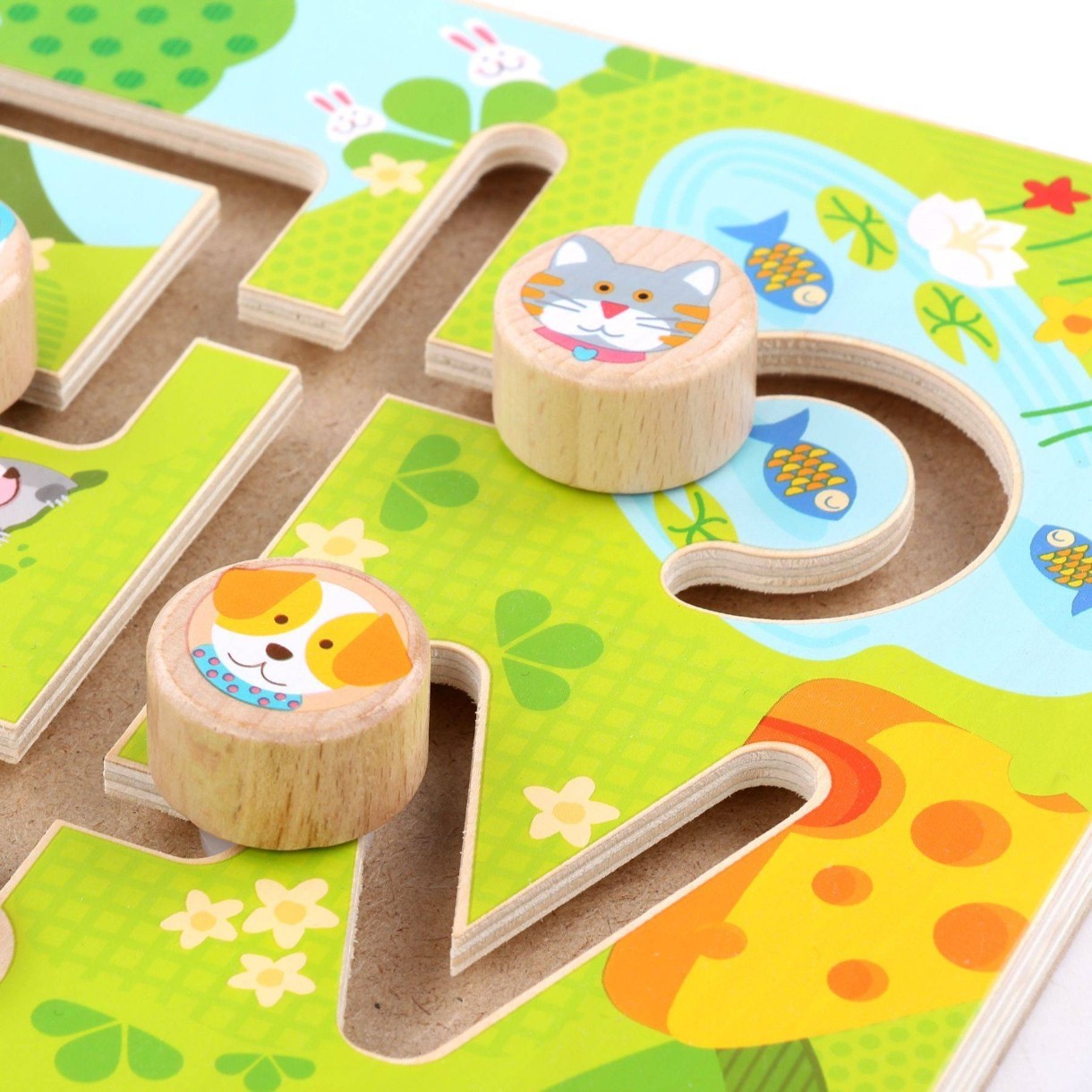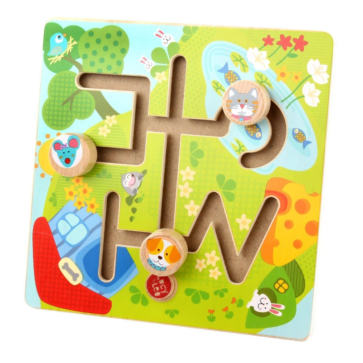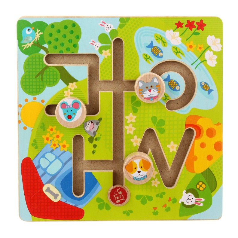 Предложите ребенку рассмотреть игрушку детально: обратите его внимание на домик, рыбок в пруду, птицу на дереве, выглядывающего из норки крота. Малышу обязательно понравится двигать по проложенным маршрутам веселых персонажей - собачку, кошку и мышь.