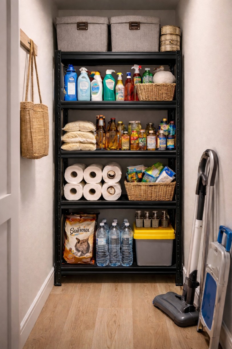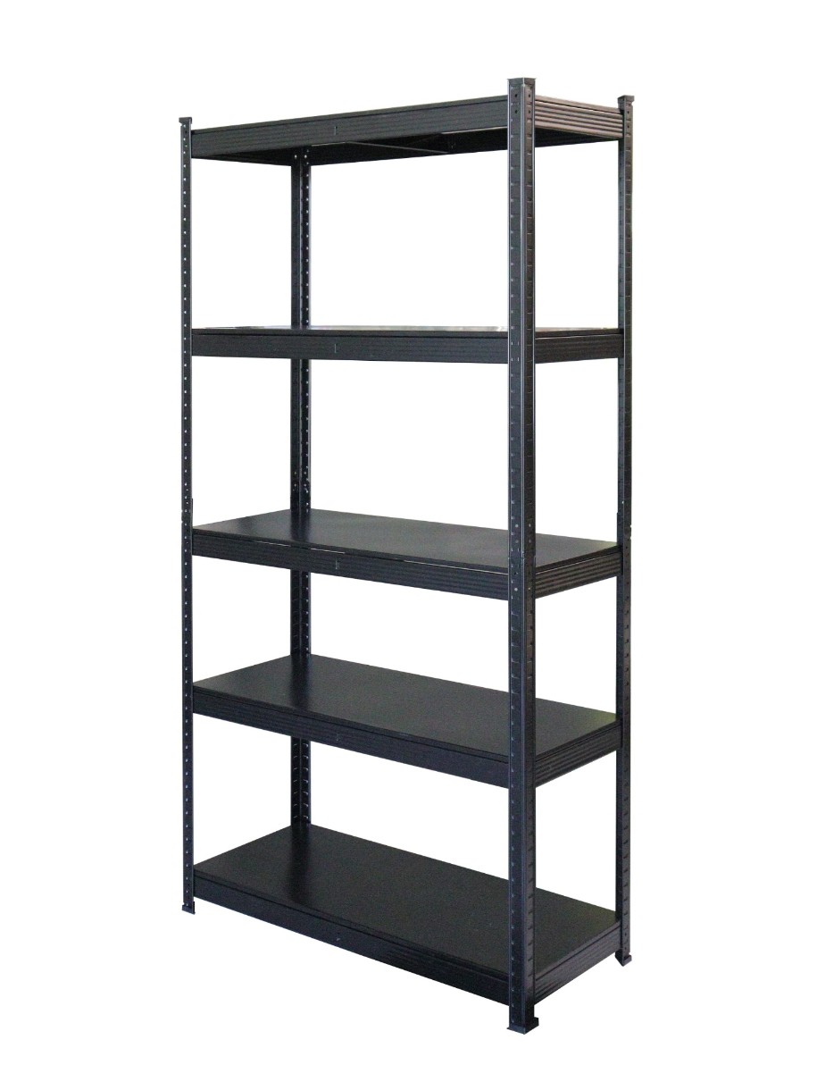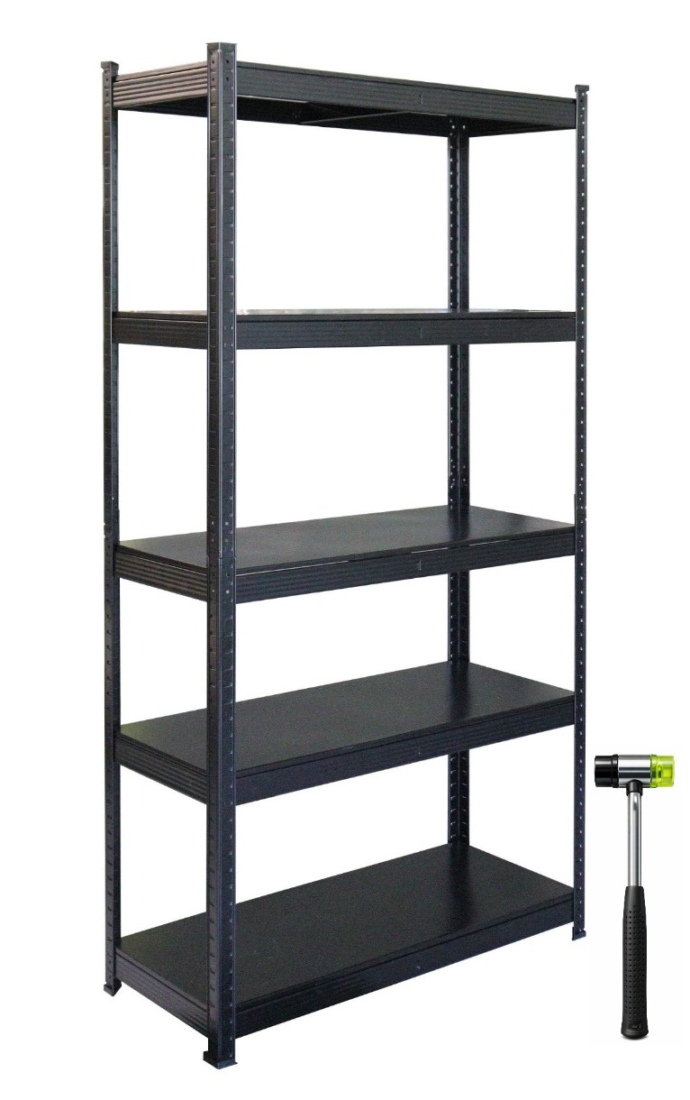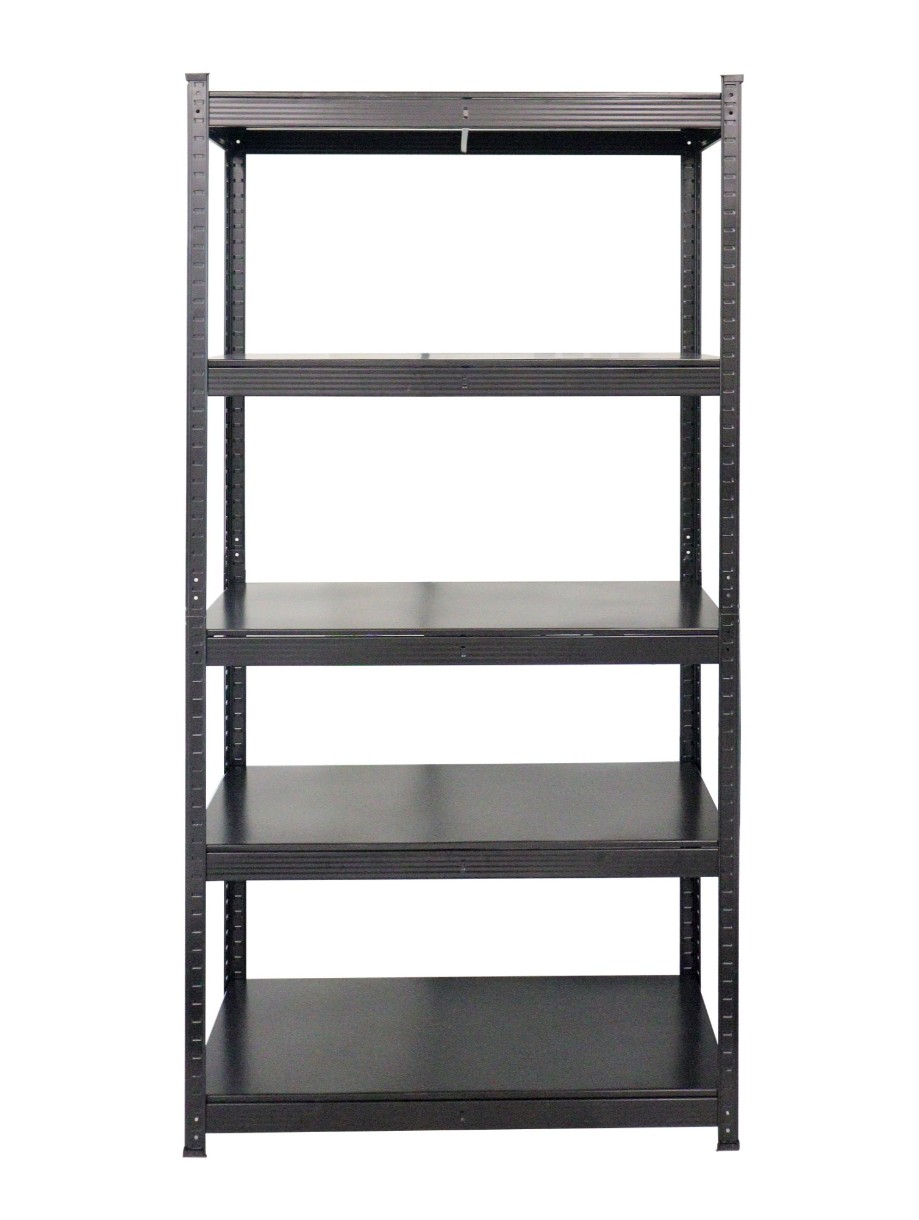 Конструкция выполнена из прочного металла с чёрным порошковым покрытием, обеспечивающим защиту от коррозии и износа. Стеллаж оснащён 5 металлическими полками толщиной 0,4 мм, каждая из которых усилена дополнительными поперечными элементами для повышения жёсткости. Максимальная нагрузка на одну полку составляет до 175 кг.