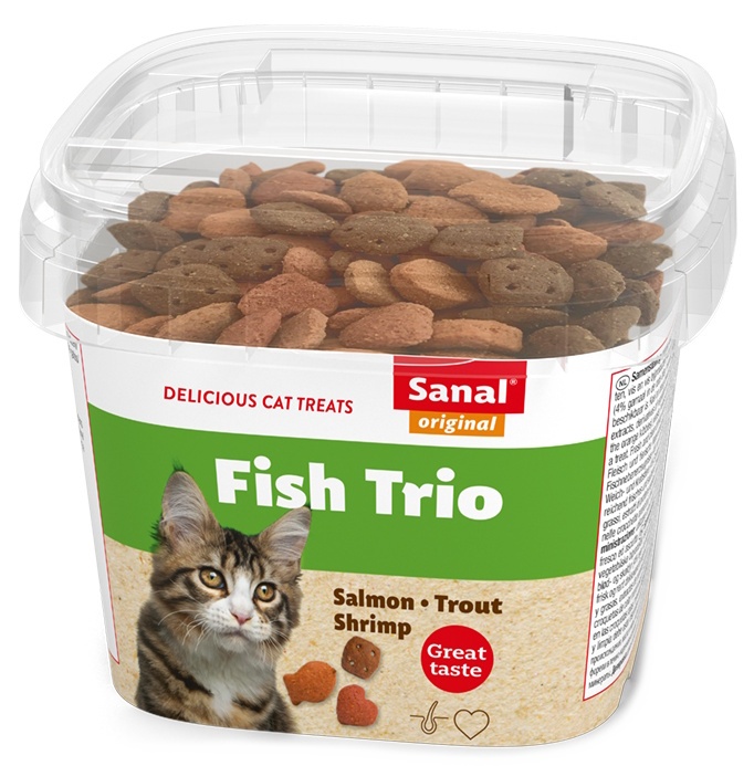 Состав: зерновые, мясо и мясные продукты, жиры и масла, экстракты растительных белков, ингредиенты растительного происхождения, рыба и рыбные продукты (4% форели в тёмно-коричневых кусочках, 4% лосося в рыжих кусочках), дрожжи, моллюски и ракообразные (4% креветки в красных кусочках), минералы.