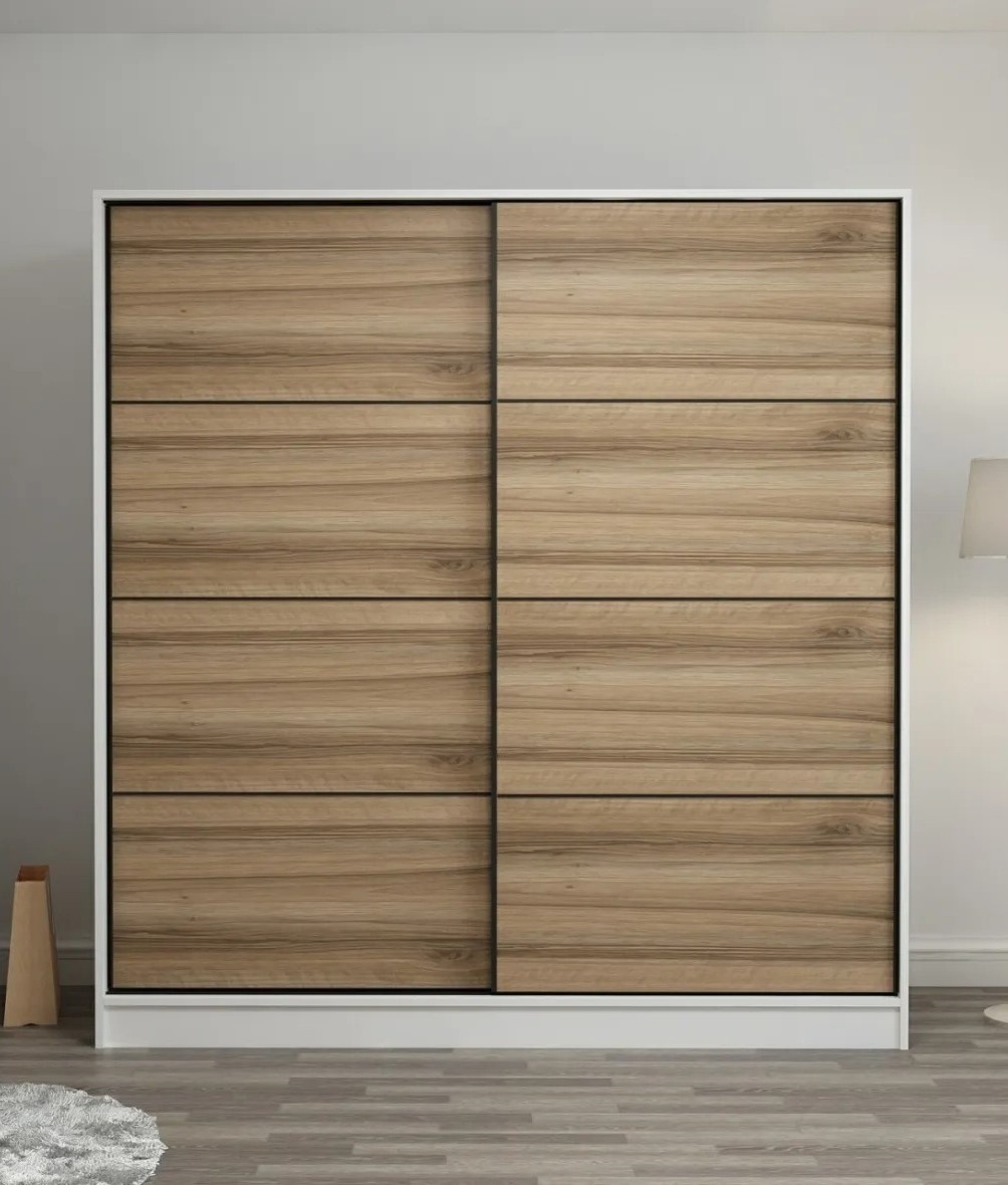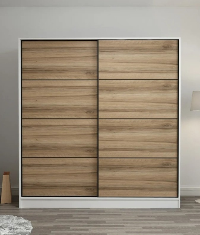 Гардероб изготовлен из древесно-стружечных панелей, покрытых 100% меламином. Толщина 18 мм обеспечивает высокую прочность и долговременную надёжность, создавая стабильное решение для хранения. Это устойчивая альтернатива нестабильным шкафам, которые быстро теряют форму.