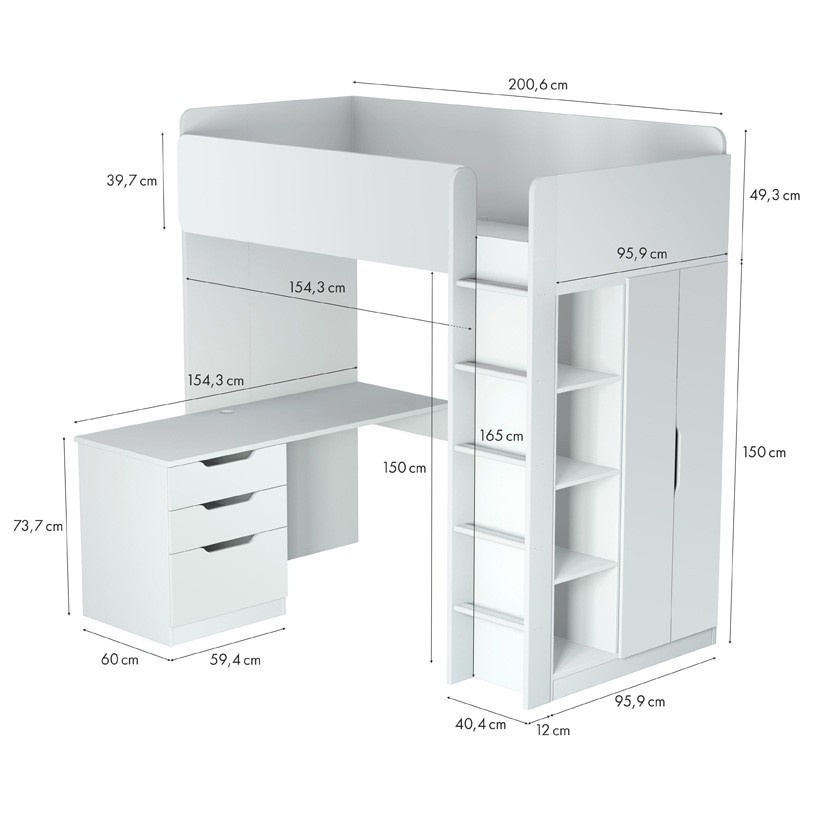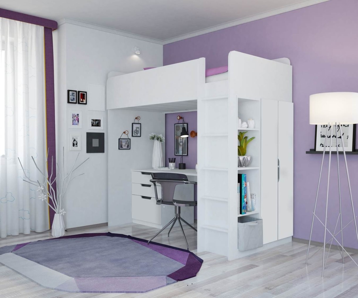 В целях обеспечения безопасности кровать - чердак Полини Симпл следует использовать детям в возрасте от 6 до 16 лет. Модель включает в себя все самое необходимое для полноценной жизнедеятельности: подростковую кровать, стеллаж, шкаф, стол, тумбу.