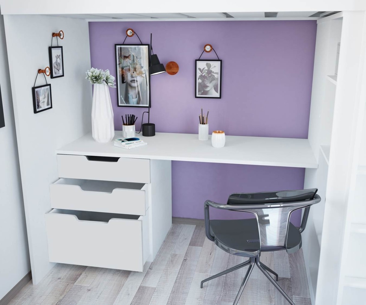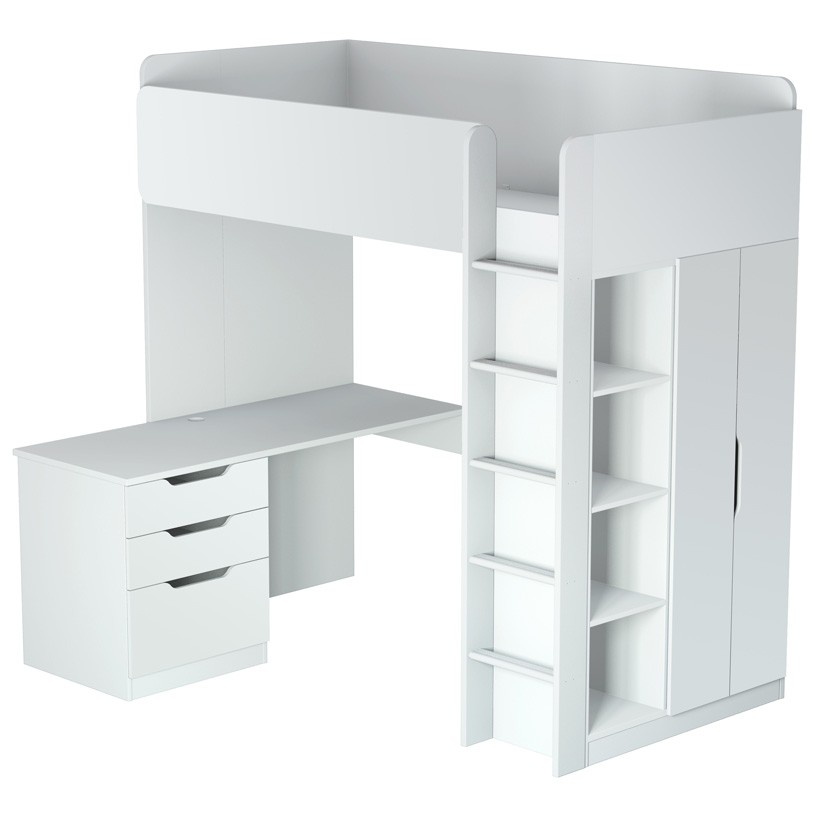 Кровать - чердак Polini Simple с письменным столом и шкафом белого цвета - многофункциональная мебель, которая обеспечит личное пространство ребенка в небольшой квартире. Белый цвет универсален и подходит малышу любого пола и возраста.. Светлая мебель визуально расширяет пространство и комната кажется светлее и больше.