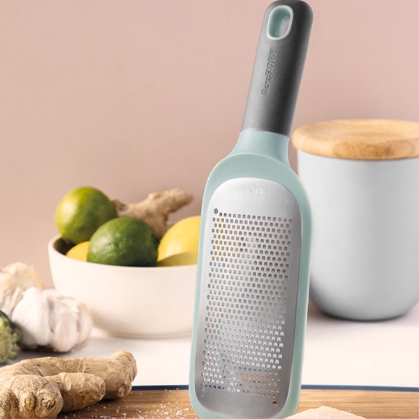 Заточка, острая и долговечная, позволяет натирать продукты в обоих направлениях. В целях безопасности терка снабжена защитной крышкой, которая так же может иметь практичное применение. Терка для цедры и имбиря идеально подходит именно для этих продуктов, поскольку имеет очень мелкие отверстия. Так же подходит для особо твердых сортов сыра. Подходит для мытья в посудомоечной машине.