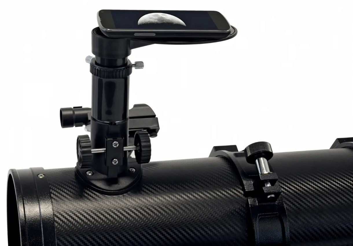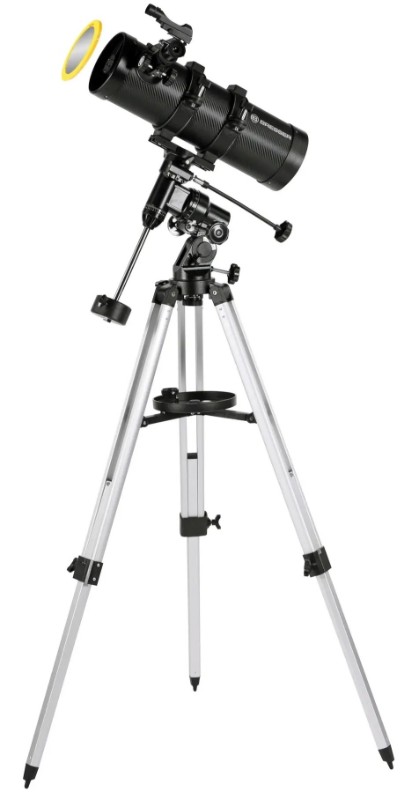 Bresser Pluto II 114/500 EQ Carbon с солнечным фильтром обеспечивает бесспорно высокое качество изображения при весьма скромных габаритах. Большая светопропускная способность даёт возможность наблюдать удалённые тусклые объекты, а экваториальная монтировка позволит следить за ними, не выпуская из виду. Телескоп отличается качественной оптикой и дает изображение высокого качества, а кроме того, телескоп оснащен достаточно большим зеркалом, которое дает широкое поле зрения. Основными отличиями от предыдущей версии являются усиленная тренога, карбоновая отделка трубы, адаптер для камеры смартфона и наличие высококачественного Апертурного Солнечного фильтра. С помощью адаптера для смартфона, идущего в комплекте с телескопом, легко фотографировать объекты наблюдений на камеру вашего смартфона. Важным моментом является наличие сертифицированного солнечного фильтра, позволяющего безопасно для глаз наблюдать за Солнцем. При помощи Солнечного фильтра Вы можете использовать телескоп для дневных наблюдений солнечной активности. Дополнительно возможна комплектация телескопа Full HD камерой для передачи изображения на персональный компьютер.
