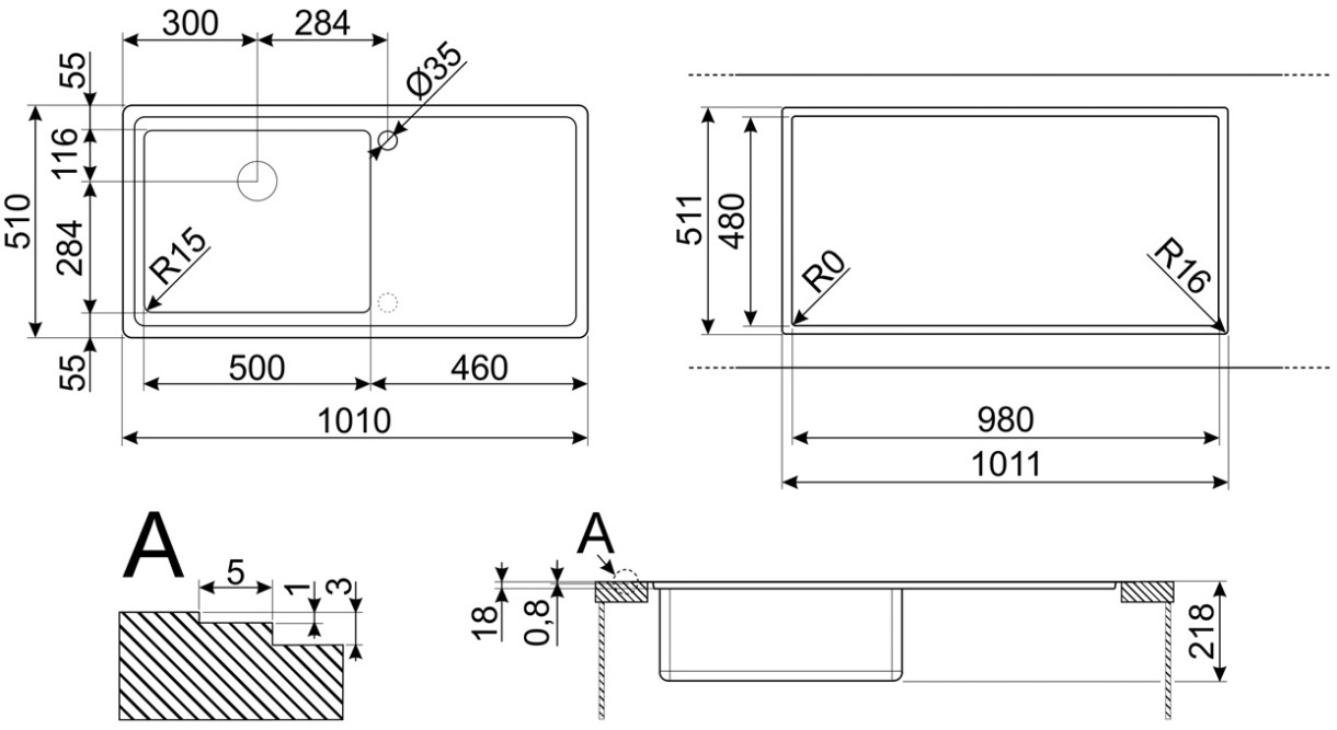 Размер мойки1010X510 мм
