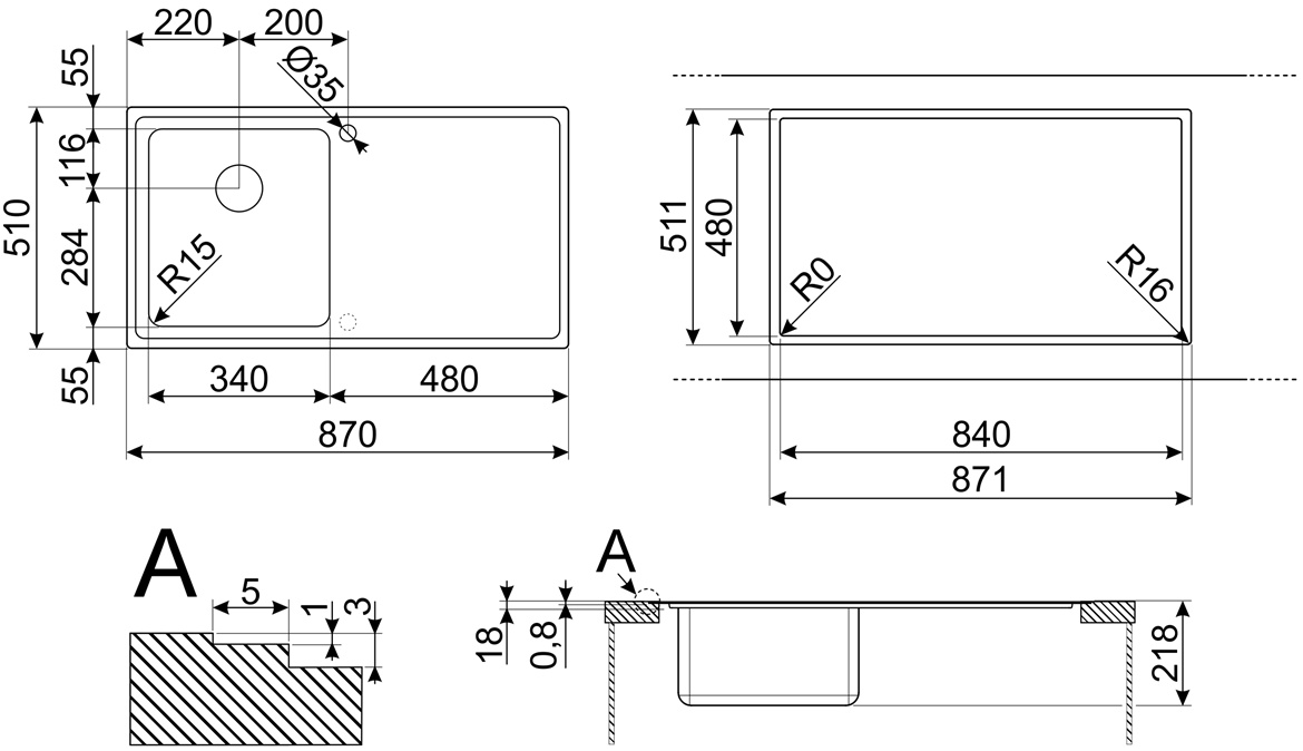 Размер мойки870х510 мм