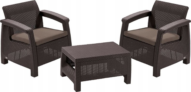 Комплект состоит из двух кресел с мягкими подушками и кофейного столика. Подходит для использования в ресторанах, в офисах, на курортах, зонах отдыха, в гостиницах, а также в коттеджах или загородных домах. Компактный, стильный и легкий садовый комплект мебели Keter Corfu II Weekend Set прекрасно впишется в дизайн приусадебных садов, террас, балконов, жилых зон отдыха, поскольку его компактная форма и оптимальные размеры позволяют оформлять также небольшие террасы и балконы. Легкая, прочная и долговечная мебель из искусственного ротанга с легкостью впишется практически в любой интерьер.