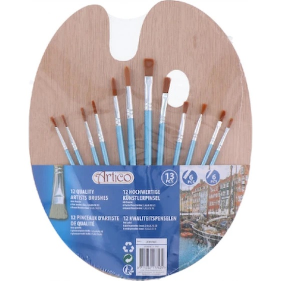Набор из 12 кистей для рисования с деревянной палитрой . Кисти для детей: 6 круглых и 6 плоских, в комплекте с палитрой. Материал: дерево, нейлон. Кисти подходят для масляных, акварельных и акриловых красок.