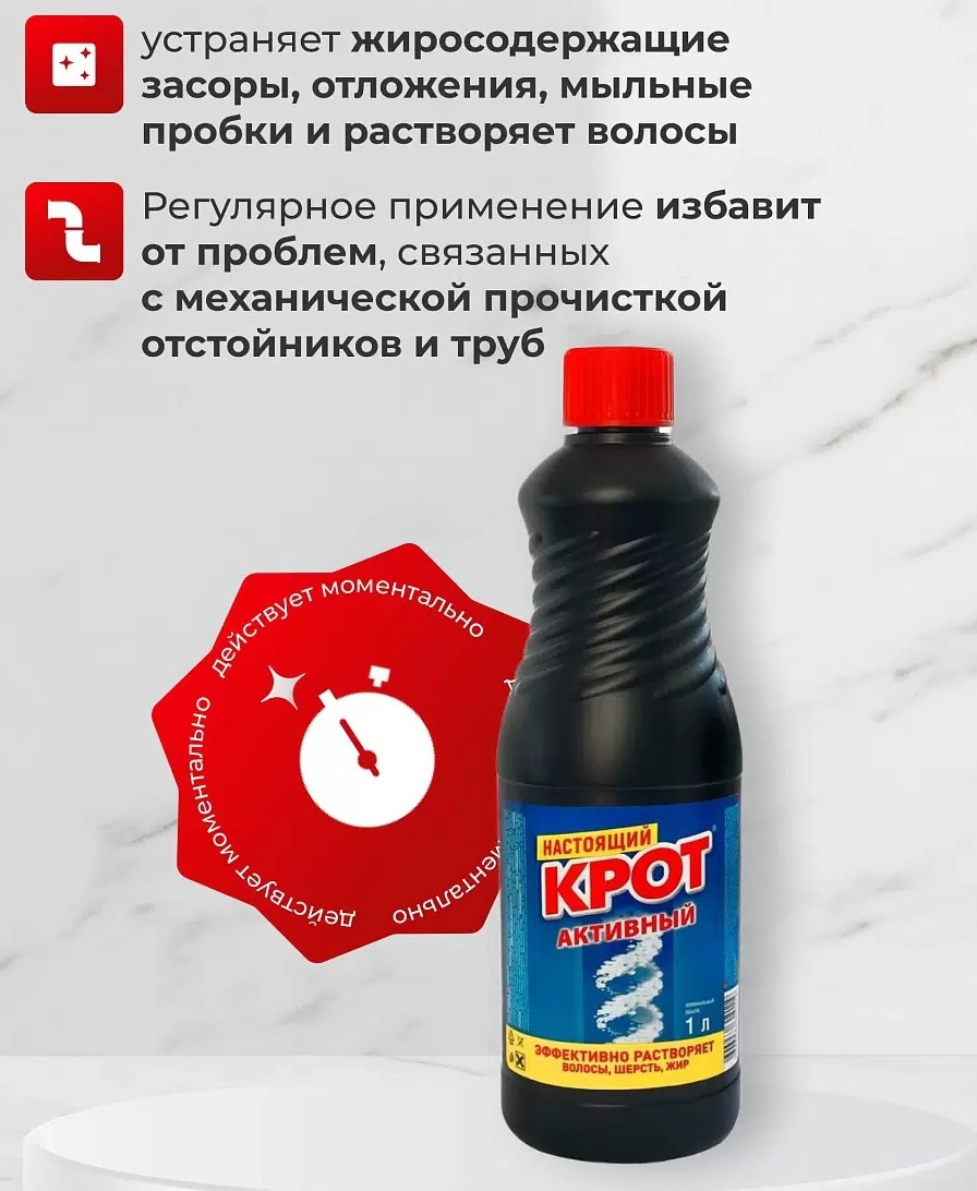 Крот Активный-эффективное средство для прочистки канализационных труб и устранения пробок из волос, жира, остатков пищи и других органических загрязнений. Оно помогает быстро восстановить нормальный слив воды и предотвратить неприятные запахи. Средство подходит для всех видов труб и облегчает уход за сантехникой. Применяется в ванных комнатах, на кухне и других местах с засорившимися стоками. Рекомендуется соблюдать инструкцию по применению и меры безопасности при использовании.